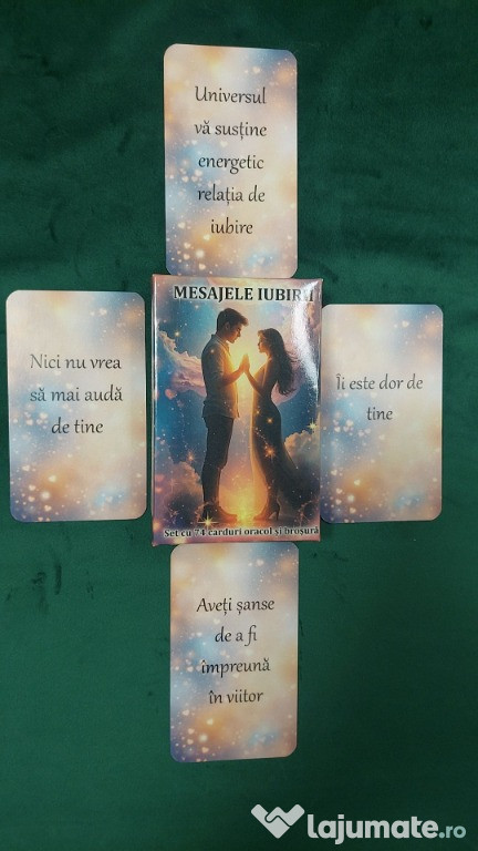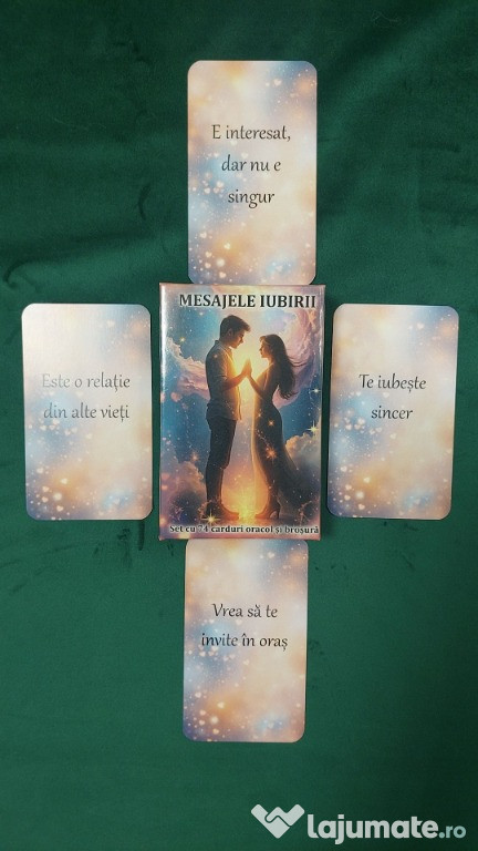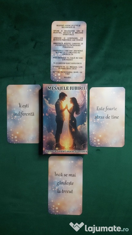 Iubire iti vorbeste! instrument intuitiv pentru imbunatatirea relatiei de cuplu. crede in propria ta magie! ghidare mistica si inspirationala in calatoria ta interioara - raspunsuri la intrebari personale. iubire iti vorbeste! • ce gandeste? ce simte? ce intentioneaza? • cum arata relatia ta in acest moment? • adevarul ascuns despre sentimentele sale • care este lectia acestei relatii? • ce va leaga cu adevarat? simti o conexiune instantanee si profunda cu cineva pe care tocmai l-ai cunoscut? ai un sentiment de familiaritate, incredere, intelegere si sentimentul ca va cunoasteti de vieti intregi? sufletele se recunosc unele pe altele nu dupa felul in care arata, ci dupa felul in care se simt la nivel de dragoste, confort, intimitate, sexualitate, spiritualitate, compatibilitate si incredere. este el cel mai bun prieten al tau in momentele dificile? simti o senzatie de calm cand esti in preajma lui? ai un sentiment de empatie, respect? te echilibreaza pentru ca aveti aceleasi obiective in viata? te simti cu adevarat inteleasa, acceptata si sprijinita? aveti interese si hobby-uri similare? cu toate diferentele si conflictele dintre voi, le rezolvati pentru ca vreti sa fiti impreuna si pentru ca relatia voastra este cea mai importanta? niciun partener nu poate fi de acord cu tine tot timpul, dar sufletele compatibile au in comun valorile si deciziile cele mai importante. exploreaza-ti sentimentele la un nivel mai profund si afla motivele pentru care te simti asa cum te simti prin auto-reflectie si analiza. 74 de mesaje pentru a avea ghidare in provocarile tale relationale. oracolul mesajele iubirii este conceput pentru a-ti face alegerile in armonie cu inima si sufletul tau, intr-un mod intuitiv. contine: 74 de carduri oracol + o brosuraAnuntul 1 Set de Carduri Oracol - Mesajele iubirii este adaugat de pe LaJumate.ro.