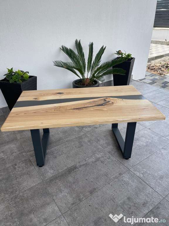 Vând măsuță de cafea realizată manual din lemn masiv de frasin și rășină epoxidică neagră lucioasă.Design modern, cu linii drepte și picioare metalice negre, vopsite electrostatic, potrivită pentru interioare elegante sau rustice.