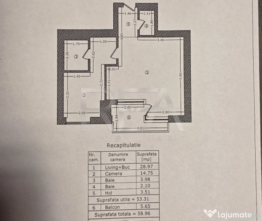 Suprafață totală de 58,96 mp, din care 53,31 mp utili și un balcon de 5,65 mp,