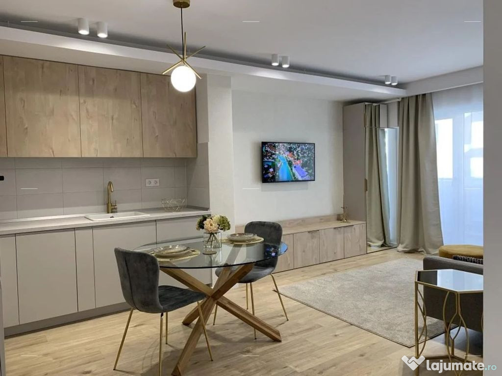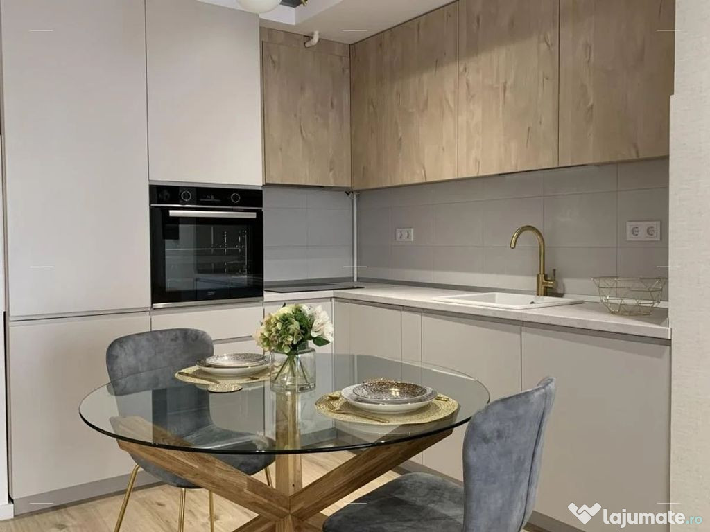 Apartamentul este echipat cu masina de spalat rufe si uscator, masina de spalat vase, plita inductie, cuptor, frigider, hota.