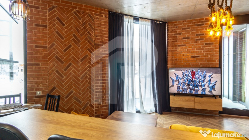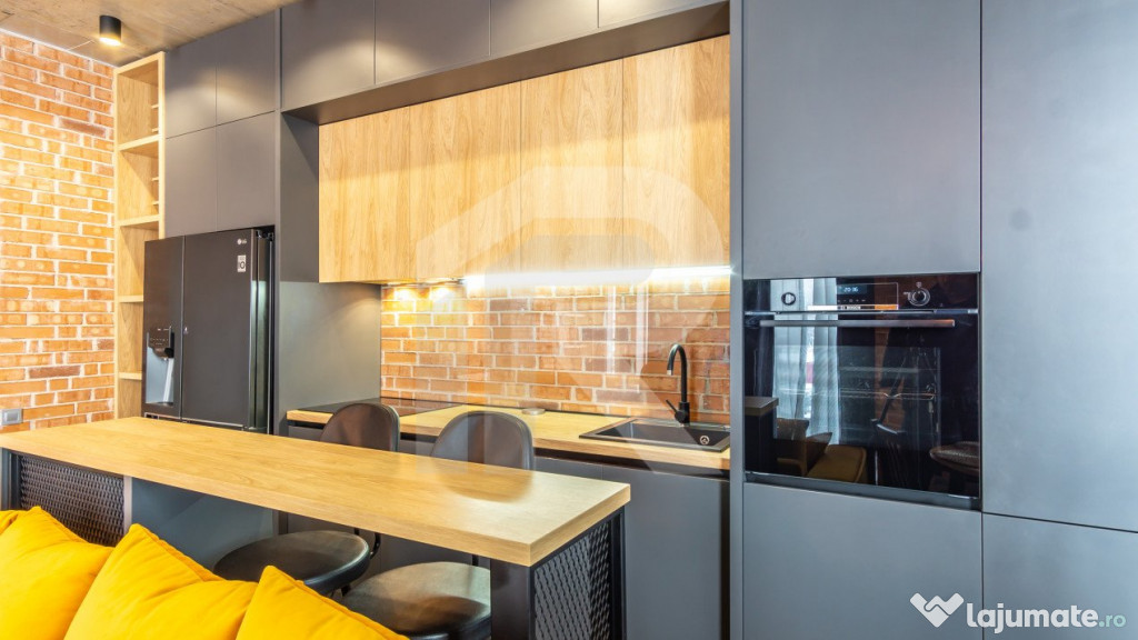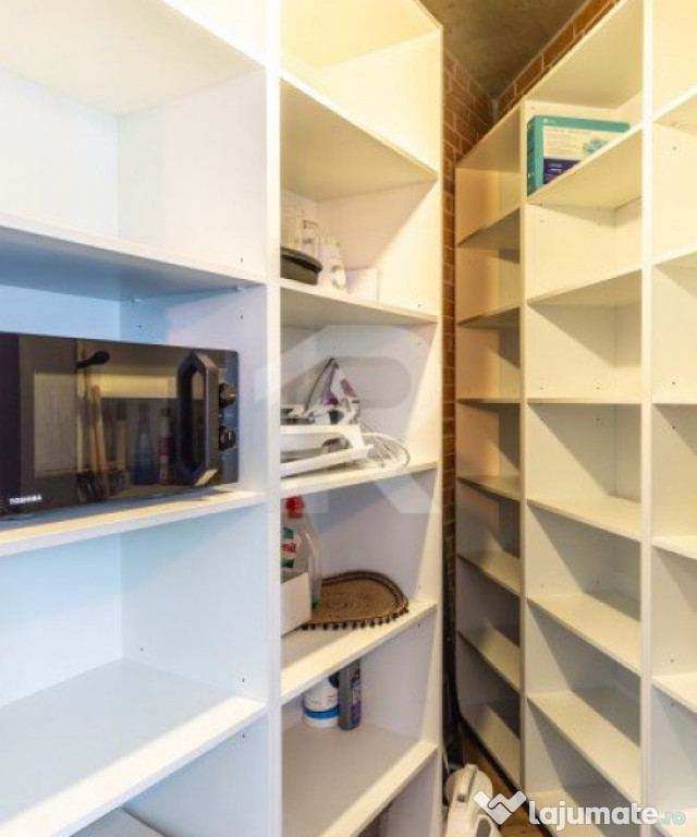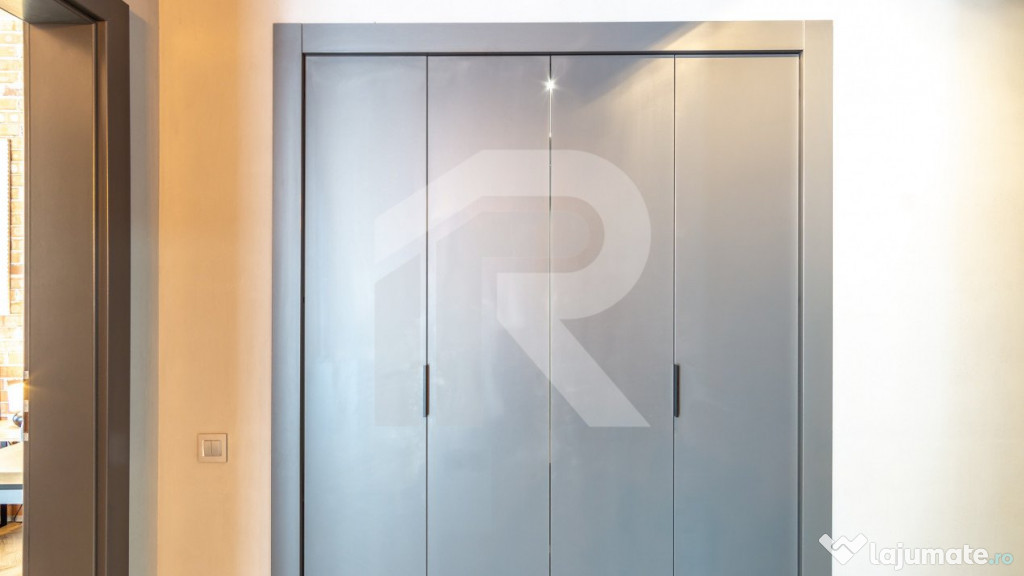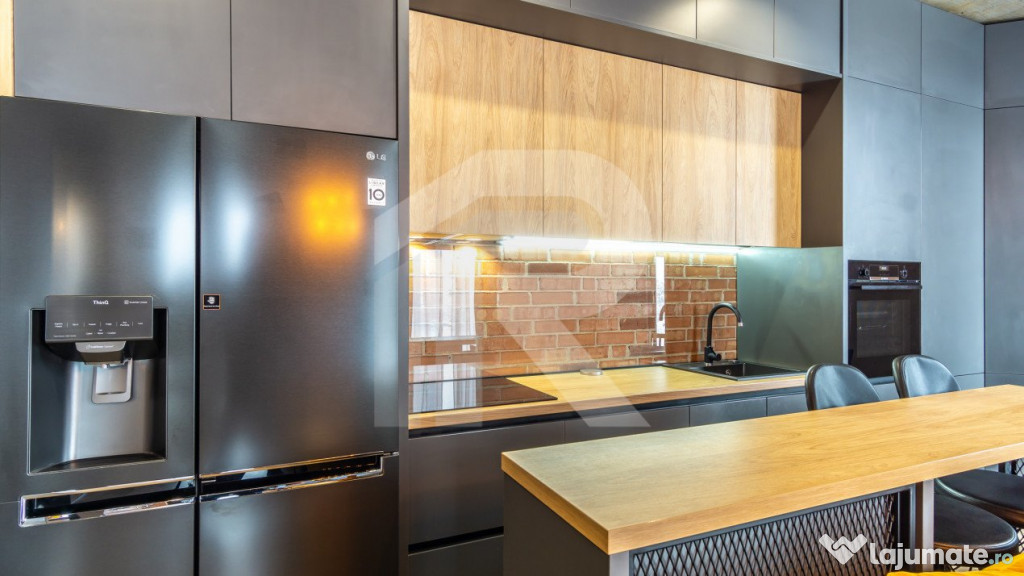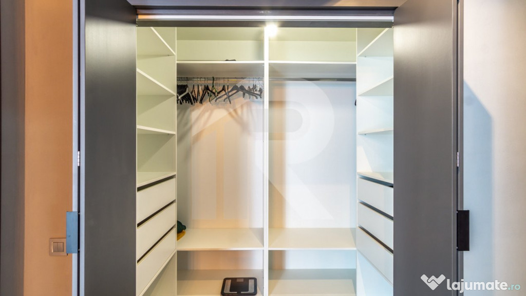 Apartamentul este complet mobilat si utilat, avand masina de spalat rufe si uscator, TV plasma 155 cm diagonala, cuptor si plita electrice, hota, cuptor microunde, expresor, aspirator, masina de spalat vase si frigider side by side.