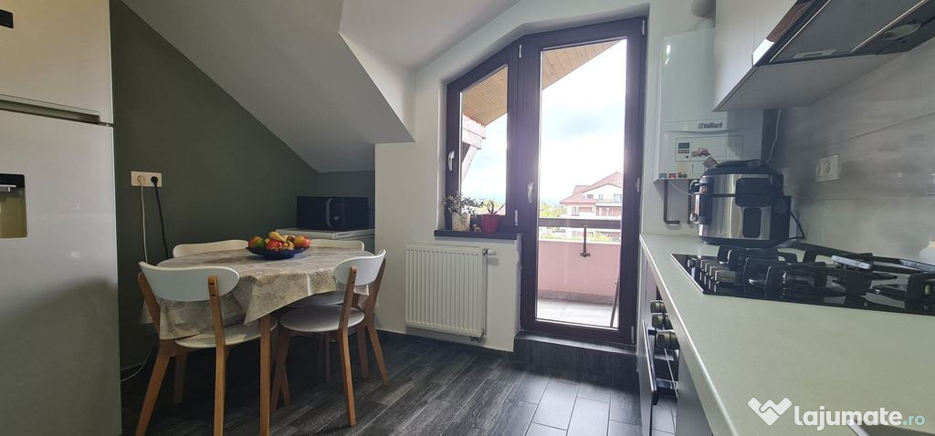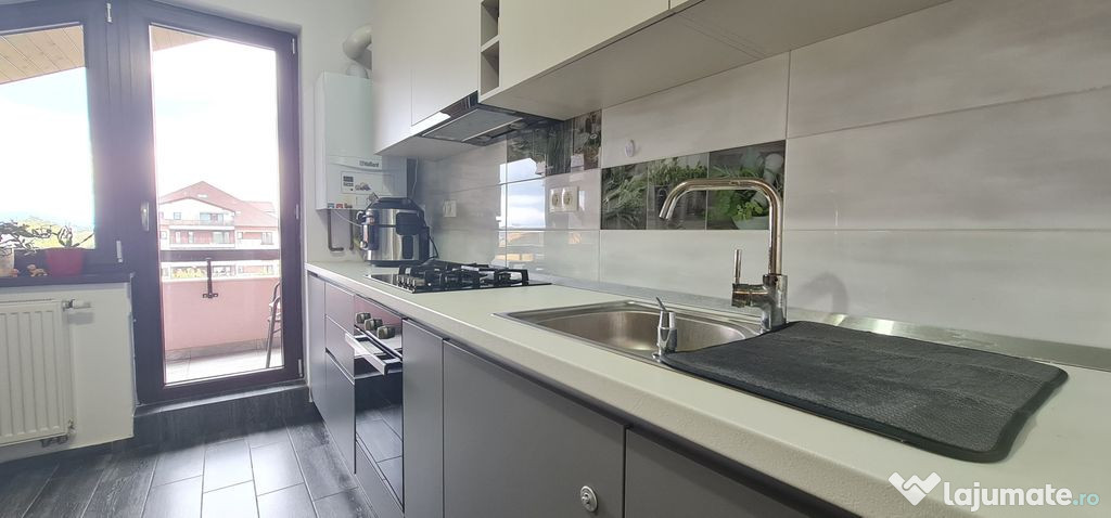 Locuința are o suprafata utila de 55.00 mp, este luminoasă, are vedere pe 2 parti, dispune de un balcon de 3 mp cu vedere spre peisajul montan, si are in apropiere gradinita, scoala, magazine alimentare, Coresi Shopping Resort, etc.