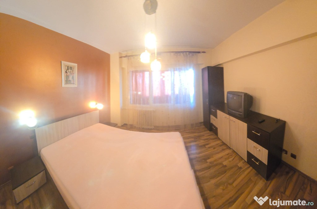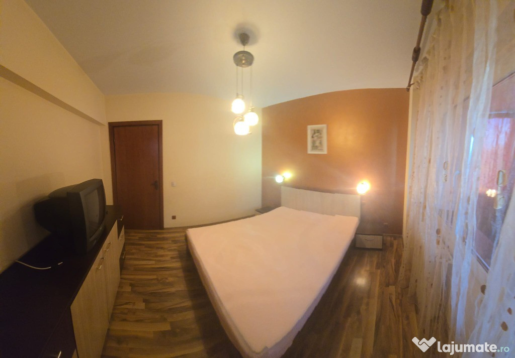 1 dormitor cu pat matrimonial, cu saltea confortabila, 2 noptiere, comoda pentru TV, dulap cu 2 usi depozitare;
