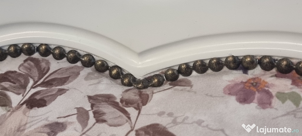 Design vintage rafinat: Cadru din lemn masiv, linii curbate elegante și finisaj alb patinat care conferă un aer romantic și clasic.