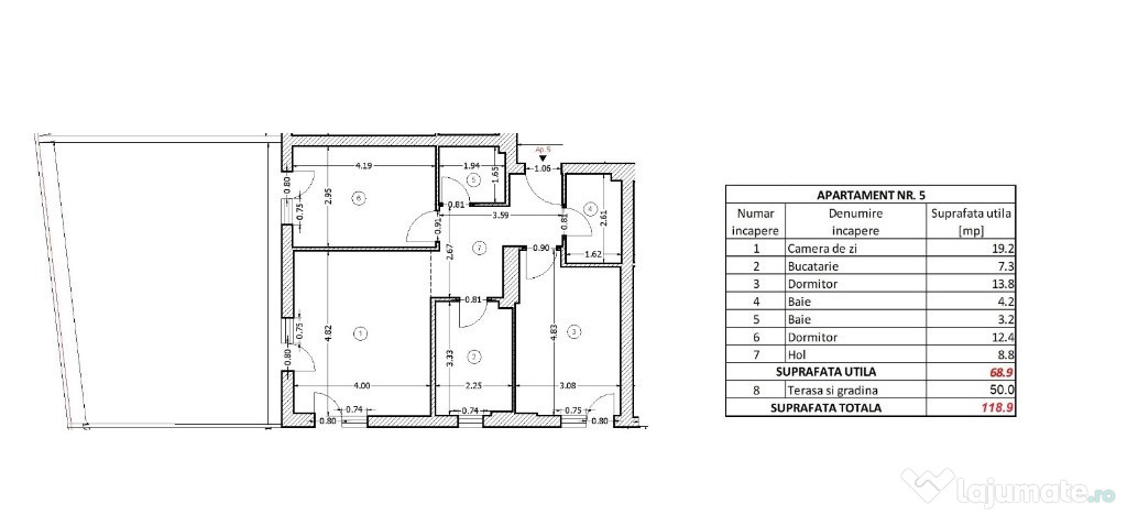 Apartamentul se află la parter și are o suprafață utilă de 68,9 mp, la care se adaugă o terasă și o grădină privată de 50 mp, rezultând o suprafață totală de 118,9 mp.