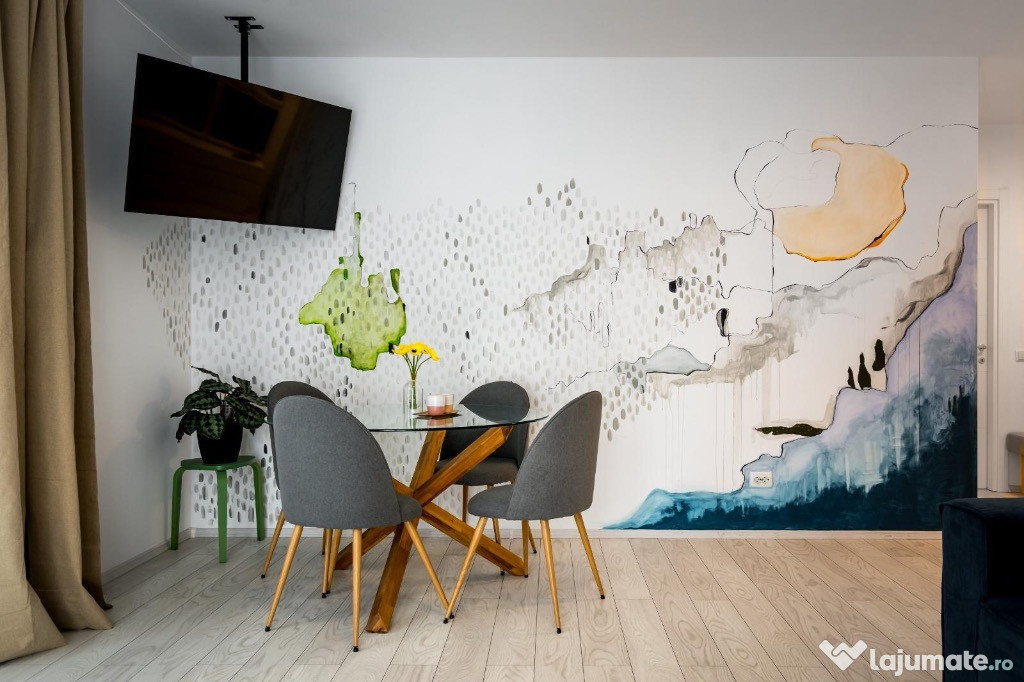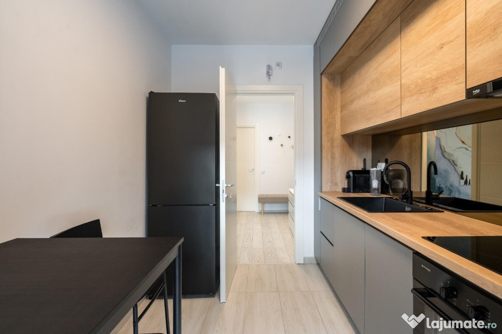 Apartamentul se vinde complet finisat, cu toate corpurile de iluminat incluse, bucătărie complet mobilată și utilată cu electrocasnice, și beneficiază de un loc de parcare inclus în preț.