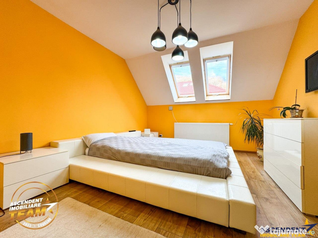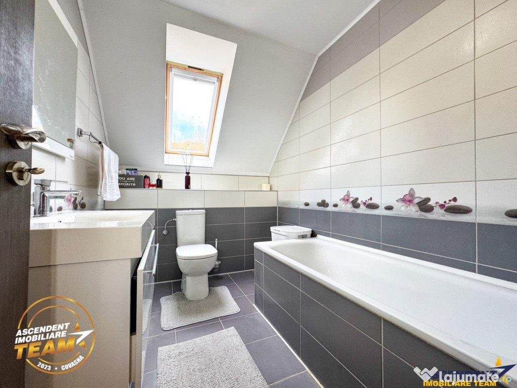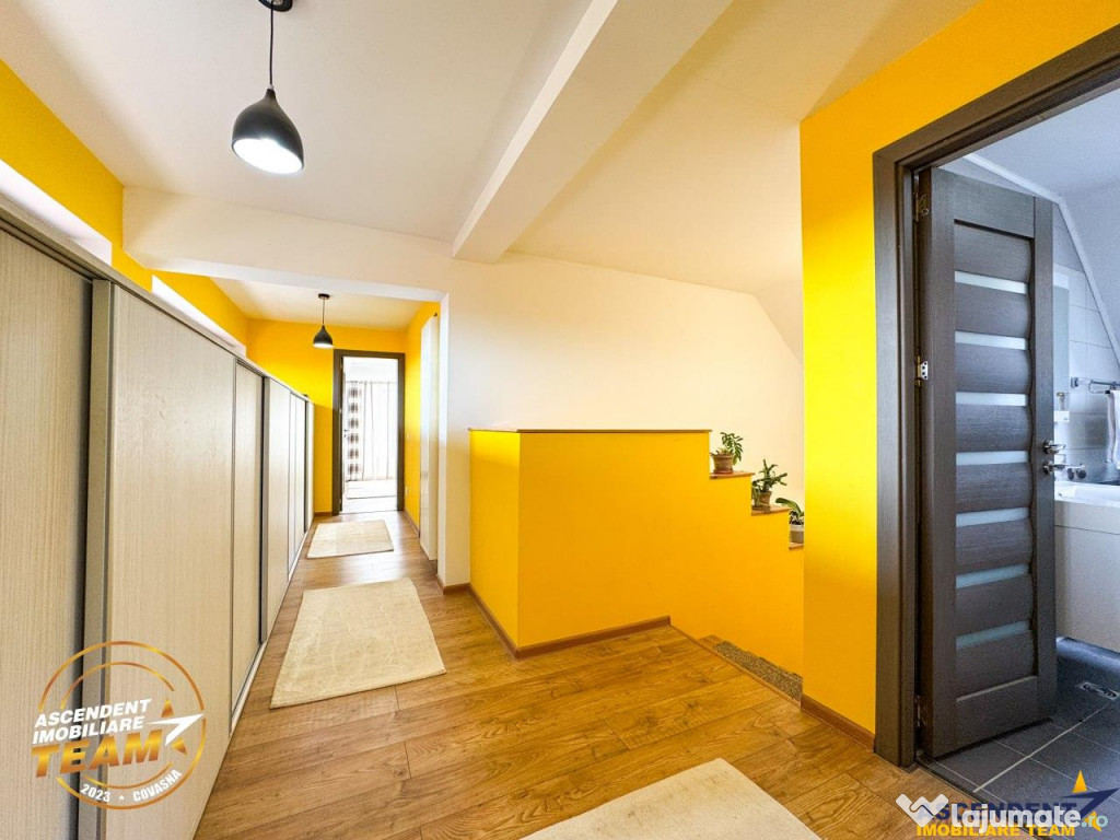 Urcand la etaj, atmosfera devine si mai calma. Dormitorul matrimonial este un adevarat refugiu, unde linistea te intampina inca de la primii pasi. Celelalte doua camere sunt luminoase si primitoare, potrivite pentru copii, oaspeti sau activitati personale. Intr-una dintre ele, accesul catre pod pastreaza o nota de poveste, un spatiu care a fost candva ascunzatoarea copiilor si care inca isi pastreaza farmecul. Holul lung, cu dulap incorporat pe toata lungimea, ofera ordine si simplitate, integrand perfect ideea de functionalitate, iar baia de la acest nivel mdash; dotata cu cada mdash; completeaza frumos zona de odihna, adaugand un plus de confort si relaxare.