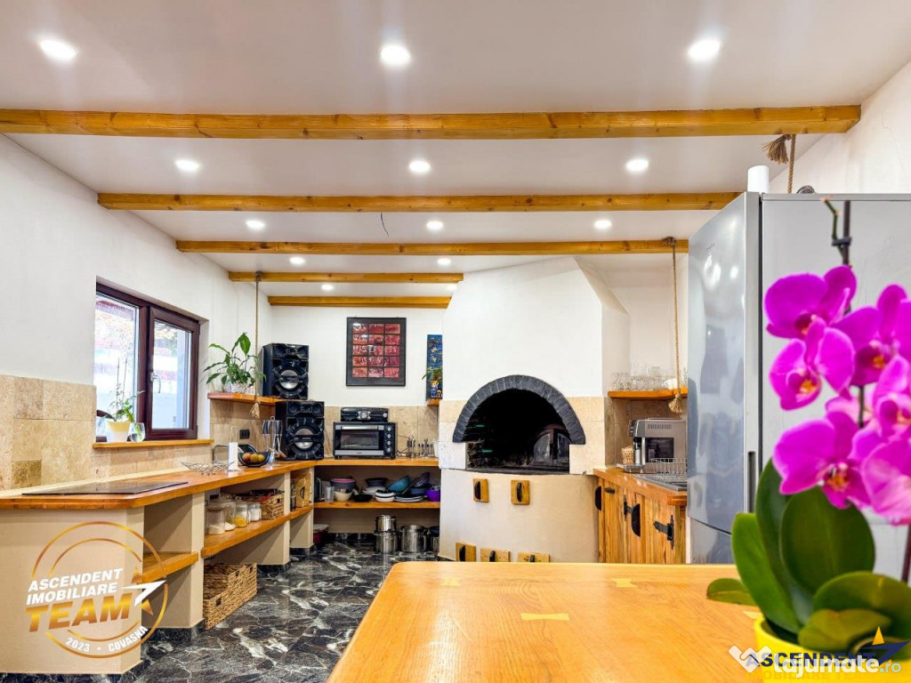 In acest decor, se integreaza perfect si anexa de 24 mp, o bucatarie de vara moderna cu accente rustice. Cu cuptorul ei traditional pe lemne, masa masiva si bancile solide, spatiul are o atmosfera autentica, unde serile se prelungesc firesc, iar rasul copiilor umple curtea. Este un loc in care te simti bine de la prima clipa, fie ca esti gazda sau oaspete.