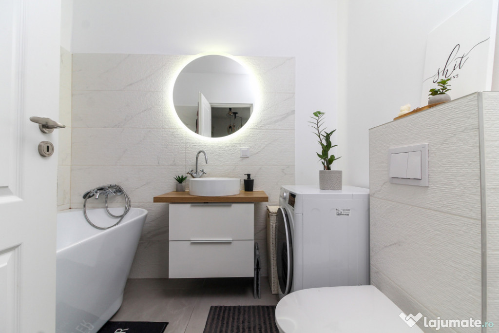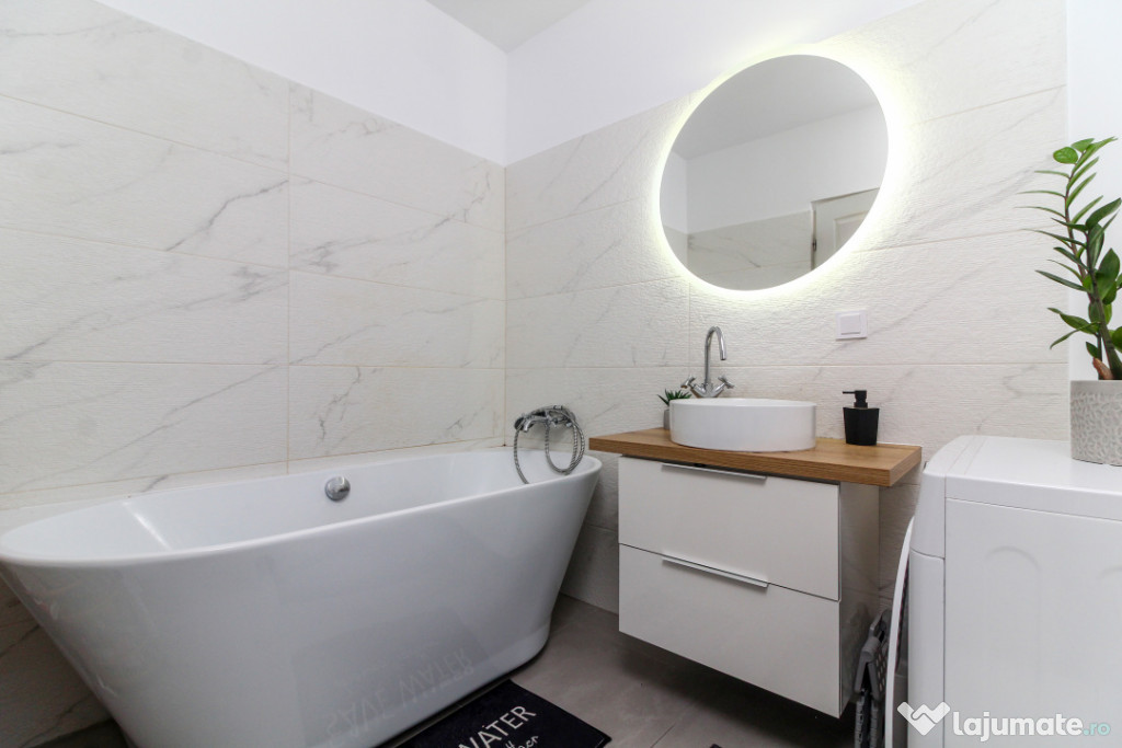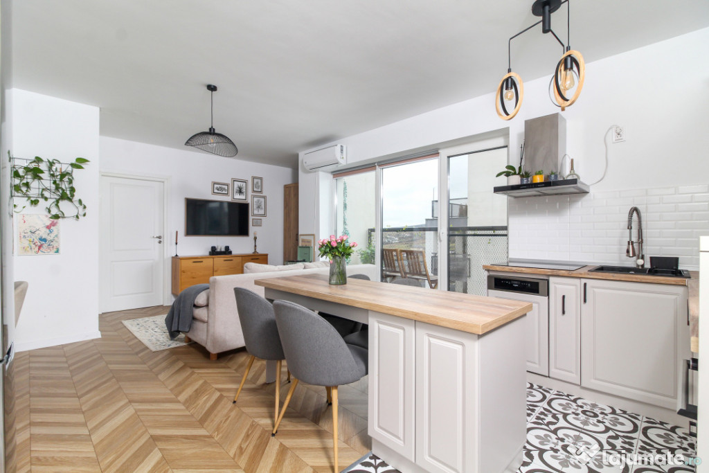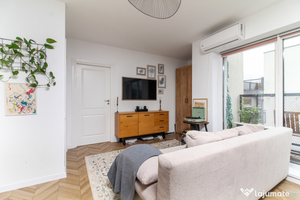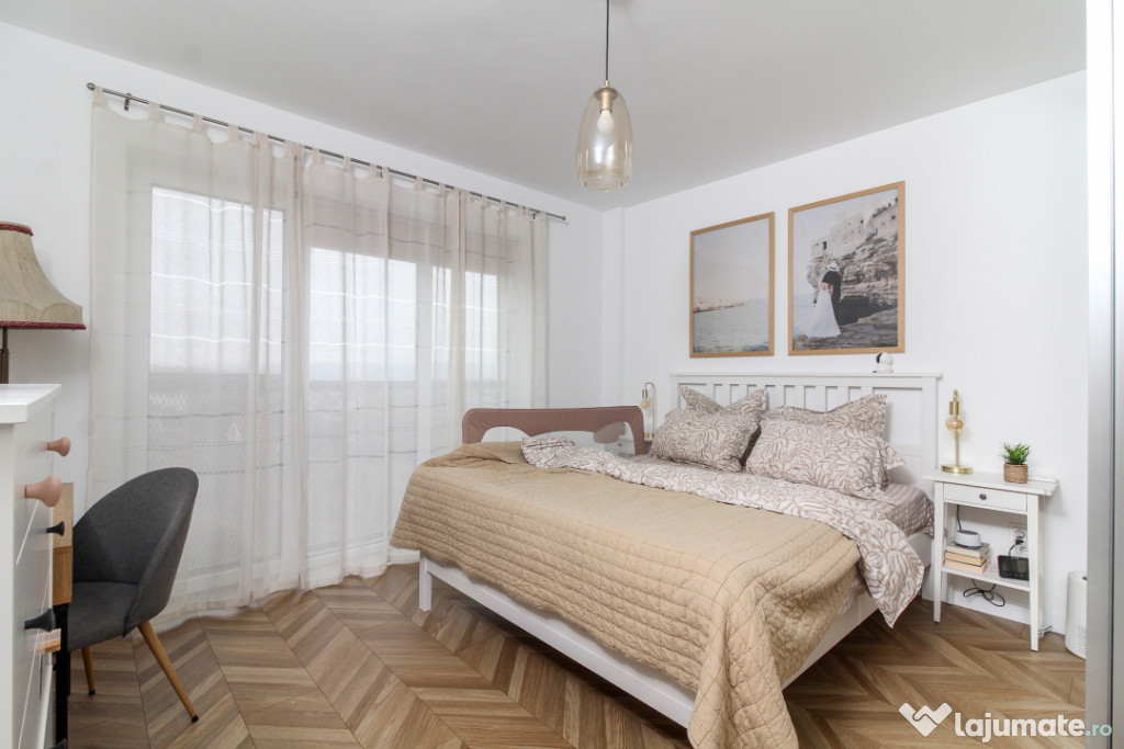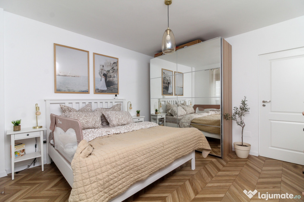 Finisajele sunt moderne, mobilierul este elegant si de calitate, iar dotarile sunt complete: incalzire prin pardoseala cu centrala proprie, ferestre tripan, contorizare separata utilitati, aer conditionat, masina de spalat vase, masina de spalat rufe, frigider, plita, cuptor si TV smart. Totul este gandit pentru confort si eficienta, astfel incat noul proprietar sa se poata muta fara investitii suplimentare.