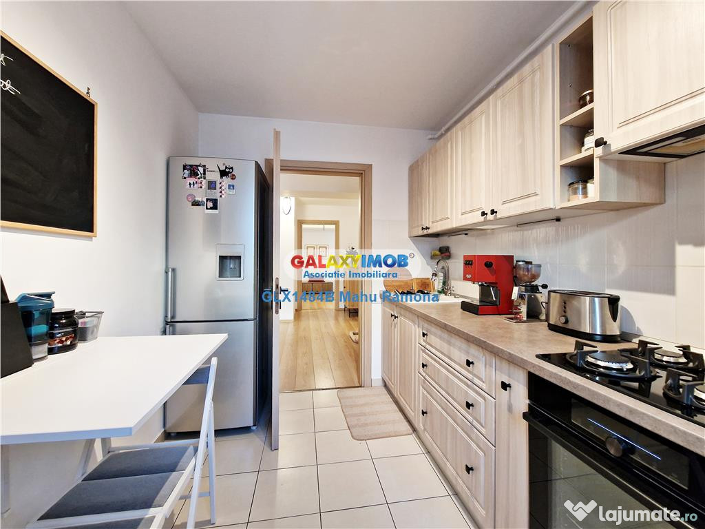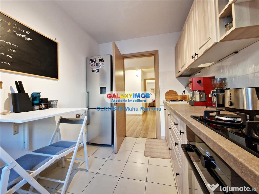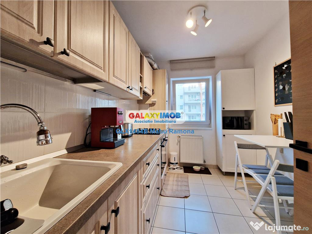 Bucataria moderna si mobilata complet, separata de living, cu o suprafata potrivita de peste 7 mp, ofera suficient spatiu pentru lucru si depozitare, chiar si pentru un loc de servit rapid masa in doi.