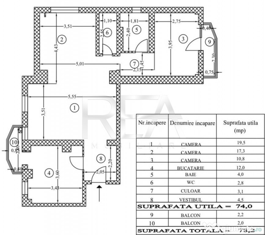 Se află la etajul 3 al unui bloc cu 4 etaje și are o suprafață utilă totală de 78 mp, din care 4 mp sunt reprezentați de cele două balcoane.