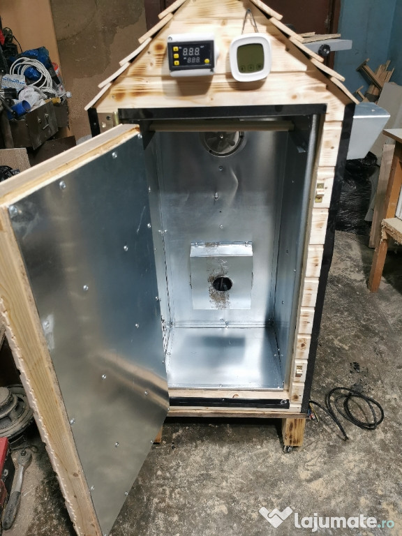 Afumatoare electrica cu convecție, temperatura controlata Afumatoare convecție cu temperatura controlata. Afumatoarea este construita din lemn, cu izolație de vata. La interior este placata cu tabla.Dimensiuni interioare
