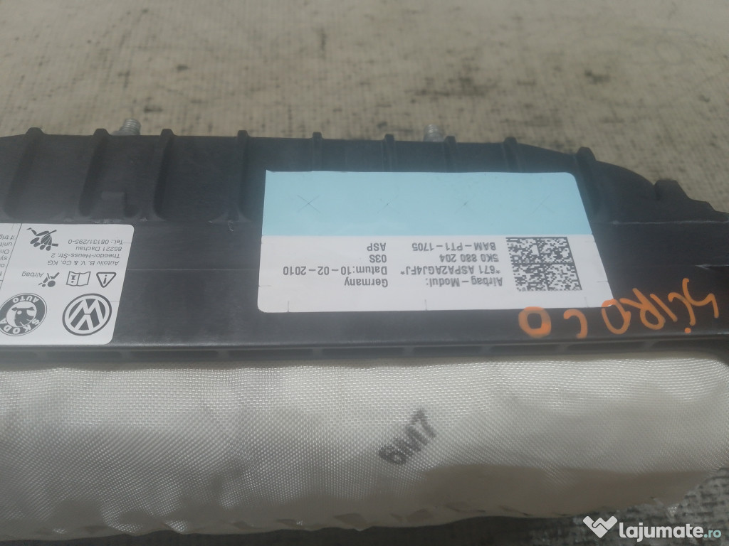 Airbag pasager Volkswagen Scirocco Motorina 2012. Cod(uri): 5K0880204. Piesele comercializate sunt originale, provenite din dezmembrari. Dispunem de o gama larga de piese multimarca. Piesele sunt verificate inainte de a fi puse spre vanzare. In caz de neconformitate piesa se poate returna. Va rugam sa verificati disponibilitatea pieselor telefonic. Trimitem in tara prin curier.Marcă: Volkswagen