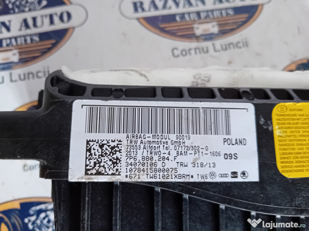 Airbag pasager Volkswagen Touareg 2012. Cod(uri): 7P6880204F. Piesele comercializate sunt originale, provenite din dezmembrari. Dispunem de o gama larga de piese multimarca. Piesele sunt verificate inainte de a fi puse spre vanzare. In caz de neconformitate piesa se poate returna. Va rugam sa verificati disponibilitatea pieselor telefonic. Trimitem in tara prin curier.Marcă: Volkswagen