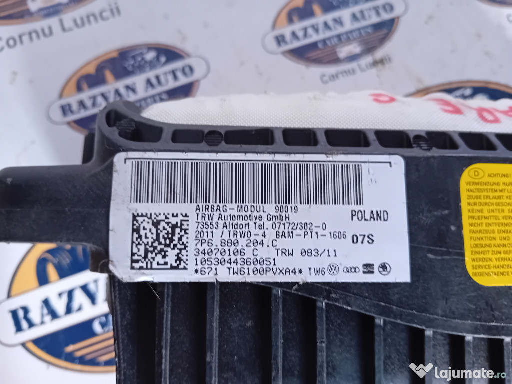 Airbag pasager Volkswagen Touareg 2012. Cod(uri): 7P6880204C. Piesele comercializate sunt originale, provenite din dezmembrari. Dispunem de o gama larga de piese multimarca. Piesele sunt verificate inainte de a fi puse spre vanzare. In caz de neconformitate piesa se poate returna. Va rugam sa verificati disponibilitatea pieselor telefonic. Trimitem in tara prin curier.Marcă: Volkswagen