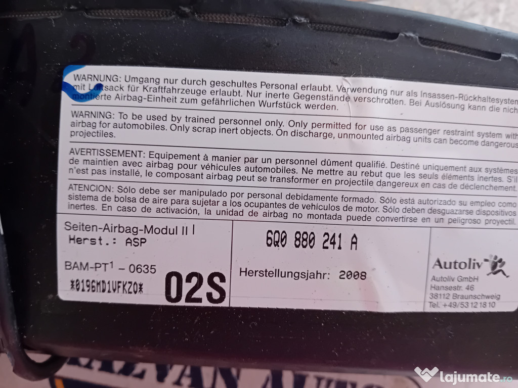 Airbag scaun stanga fata Skoda Fabia 2 2008. Piesele comercializate sunt originale, provenite din dezmembrari. Dispunem de o gama larga de piese multimarca. Piesele sunt verificate inainte de a fi puse spre vanzare. In caz de neconformitate piesa se poate returna. Va rugam sa verificati disponibilitatea pieselor telefonic. Trimitem in tara prin curier.Marcă: Škoda