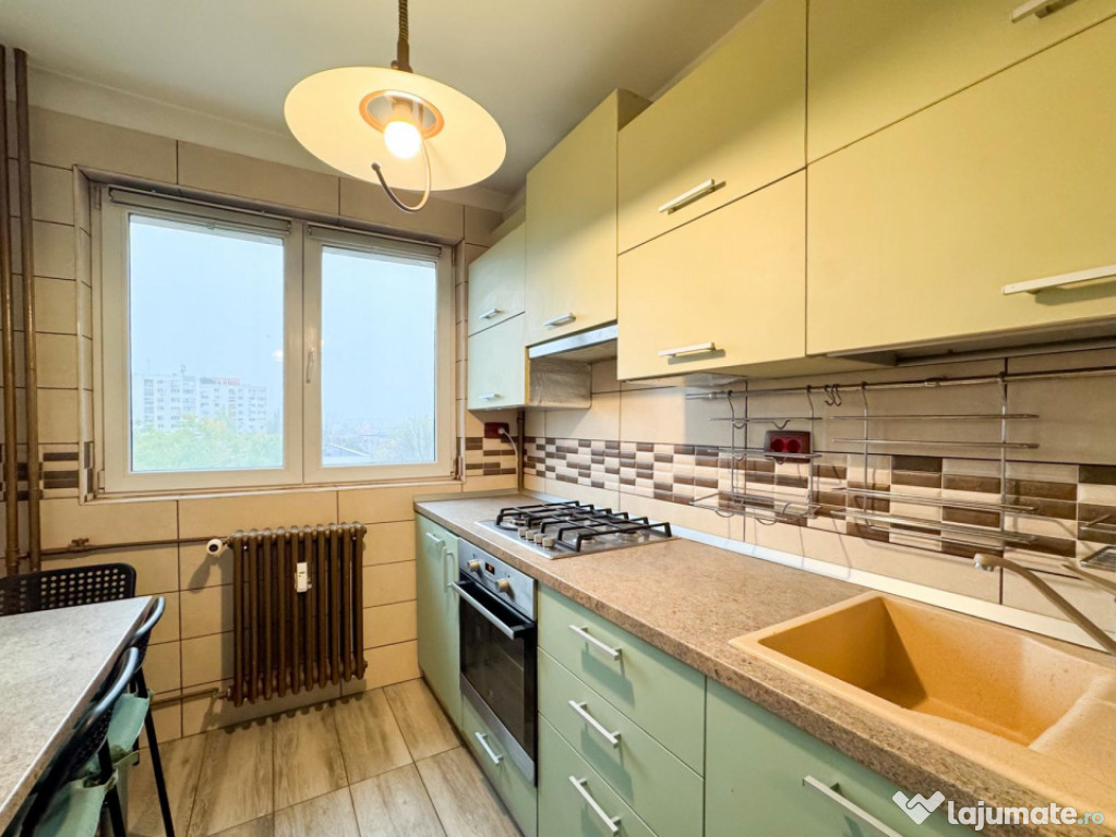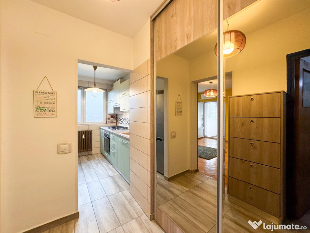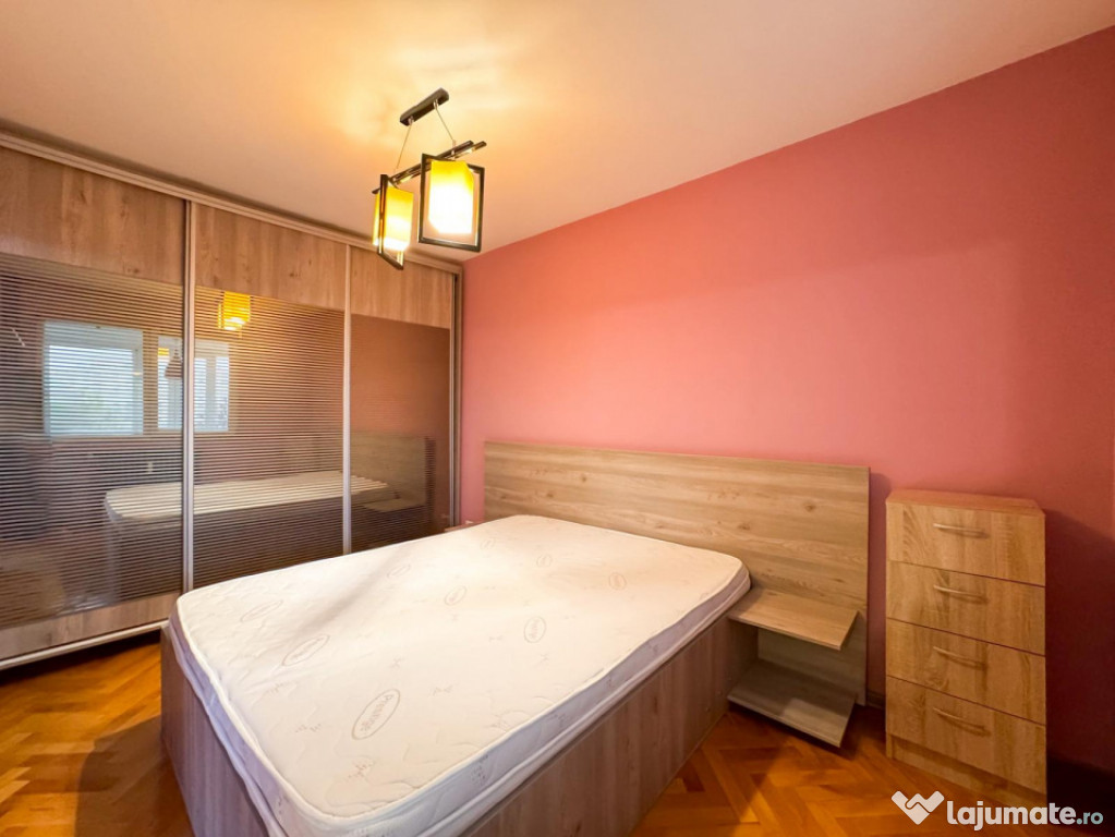 Mobilare, utilare: bucatarie complet mobilata, utilata cu cuptor, plita, combina frigorifica. Masina de spalat in nisa din holul de langa baie. Dormitor mobilat cu pat cu noptiere si sifonier masiv. Dulap de haine in holul de intrare. Canapea textil, birou, scaun birou in sufragerie. Aparat aer conditionat in sufragerie.