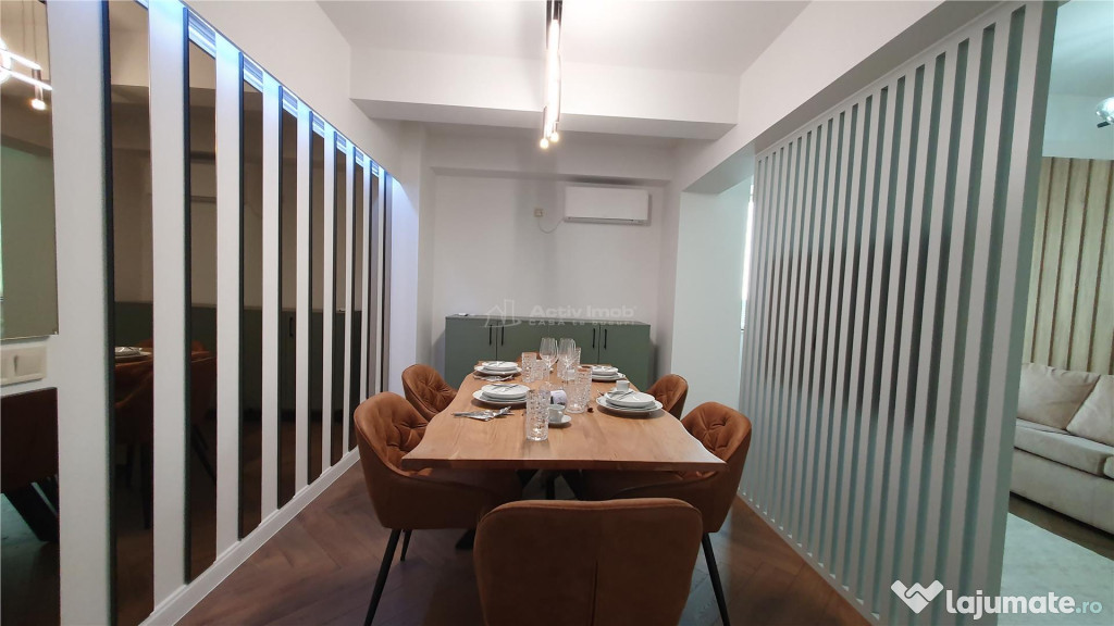 - living spatios, luminat natural, cu zona de dinig elegant, dotat cu aer conditionat si decorat cu mobilier de designer: masa din lemn masiv si scaune statement top XXL Lutz