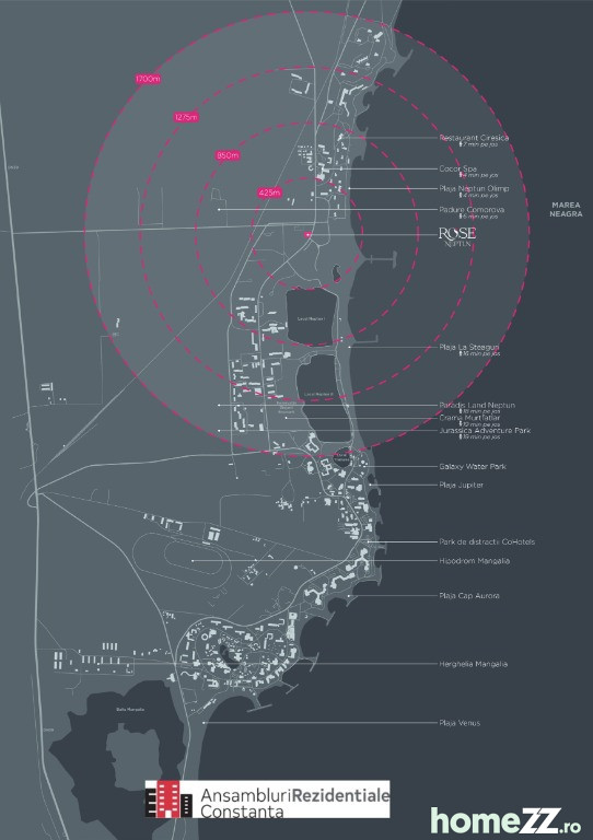 Locatia excelenta a ansamblului, il face deosebit de atractiv ca si resedinta de vacanta datorita accesului usor si rapid la plaja linistita, la 3 minute de mers pe jos pe aleea President , o zona linistita ,plina de copaci si de verdeata, monitorizata video , avand paza militara tot timpul anului 24 / 24 unde accesul auto este interzis.