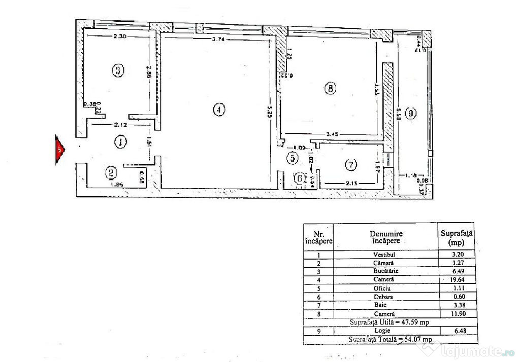 • Suprafata: 54mp, 2 camere, baie cu geam