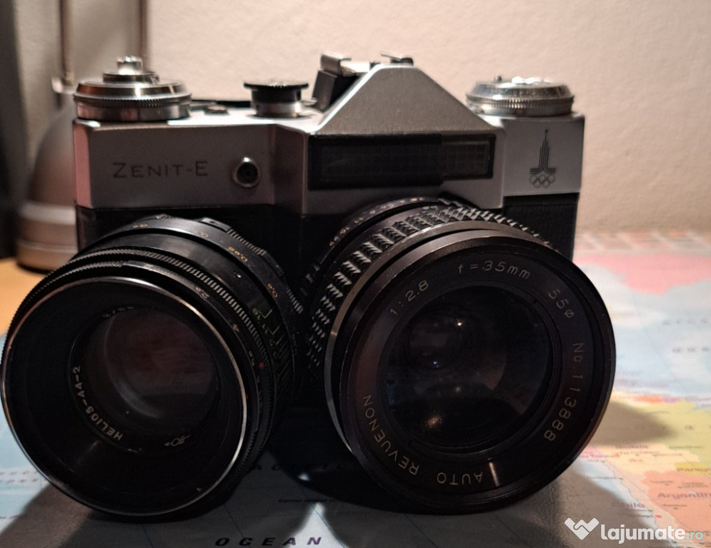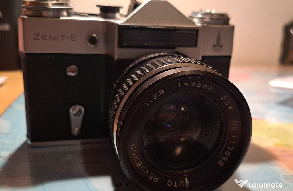 Cameră foto Zenit-E, o ediție specială care comemorează Jocurile Olimpice de la Moscova din 1980, având logo-ul olimpic pe partea frontală dreaptă. Este echipată cu un obiectiv Revuenon Auto de 35 mm f/2.8.Utilizează popularul sistem de montură M42 cu filet, permițând interschimbabilitatea cu o gamă largă de obiective.