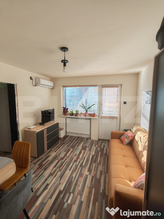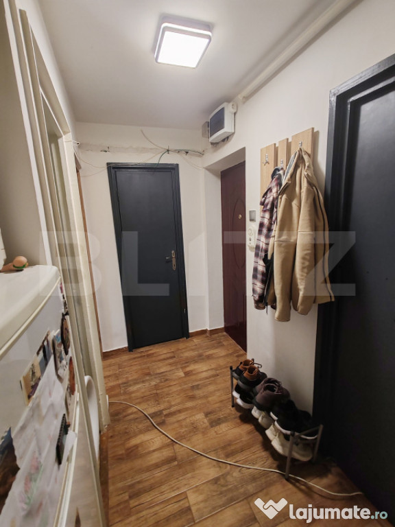 Apartamentul beneficiază de centrală termică proprie, geamuri termopan și aer condiționat în living, oferind confort pe tot parcursul anului. A fost renovat parțial, ceea ce permite personalizarea după propriul gust, cu investiții minime.