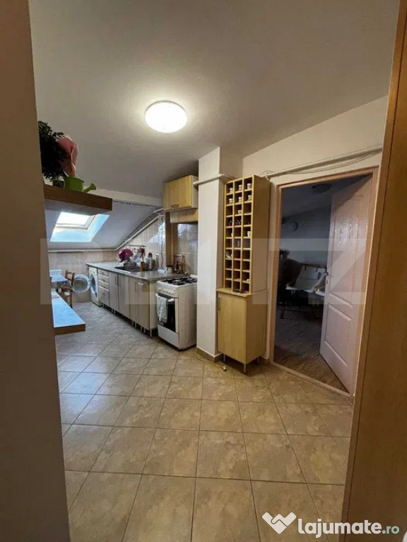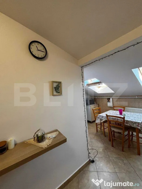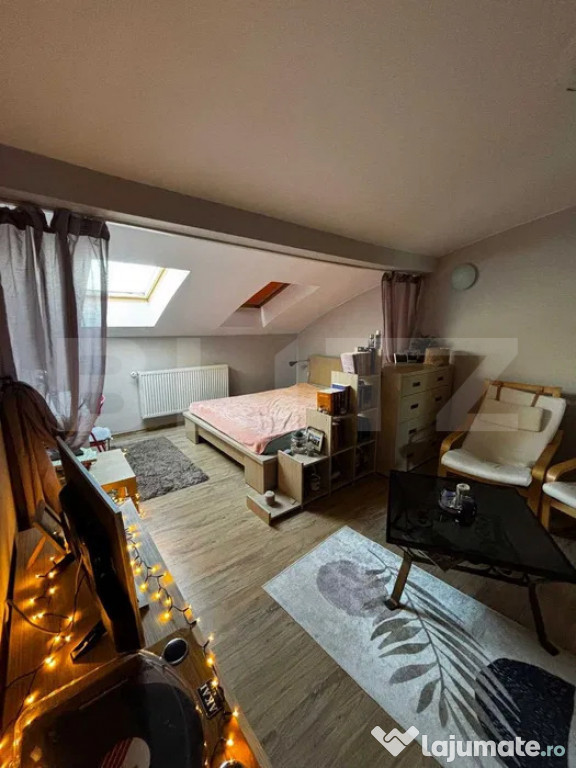 Apartamentul dispune de ferestre de mansardă Velux, care oferă lumină naturală din plin, încălzire cu centrală proprie pentru costuri reduse și se vinde complet mobilat și utilat, exact ca în fotografii. Compartimentarea este eficientă, ceea ce îl face potrivit atât ca locuință personală, cât și ca investiție, zona fiind una cu cerere ridicată pentru închiriere.