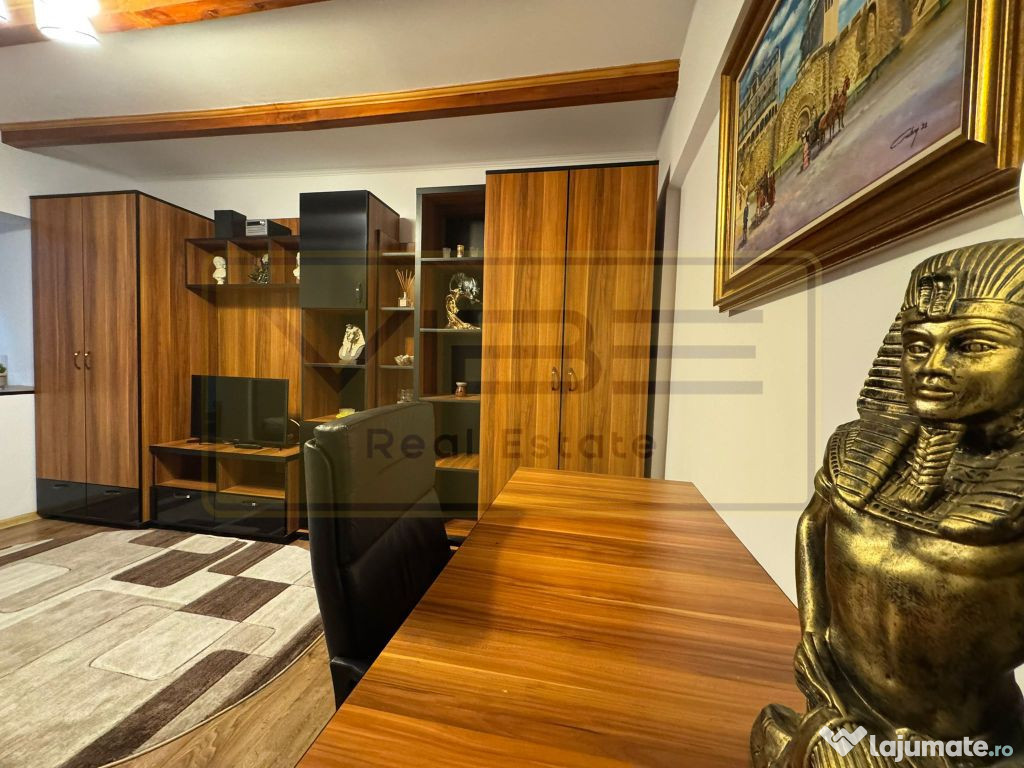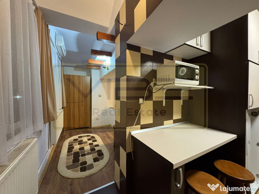 Disponibil cu mutare imediata! Agentia VIBE REAL ESTATE, va ofera spre inchiriere un apartament cu 1 camera, situat intr-un imobil dotat cu ascensor modern, din zona centrala, 5 minute de Gara principala Iasi - Mc Donald's si la doar 10 minute de mers pe jos fata de Piata Unirii -Grand Hotel Traian. Apartamentul este curat, renovat, dispune de mobilier cu multiple spatii de depozitare si bucatarie utilata+loc pentru servit masa. Camera este dotata cu pat matrimonial, birou, biblioteca=TV si balcon tip logie cu view panoramic asupra zonei Arcu-Scoala Agatha Barsescu. Confortul termic este asigurat de incalzire cu centrala termica proprie+termostat de ambient, respectiv unitate AC, pentru sezonul de vara. Baia ( cu geam pentru ventilatie naturla) este dotata cu cabina de dus, obiecte sanitare noi si masina de spalat. Pretul chiriei lunare este de 350Euro, se solicita garantie 350Euro/returnabila la finalul contractului ce se va incheia pe o perioada de minim 12 luni. Se percepe comision la agentie pentru serviciul imobiliar , 350Euro. NO PET FRENDLY . Pentru detalii va stam la dispozitie telefonic iar pentru vizionarea proprietatii este necesara o programare in prealabil, Senior Broker imobiliar Ciprian-Bogdan.Confort: 1