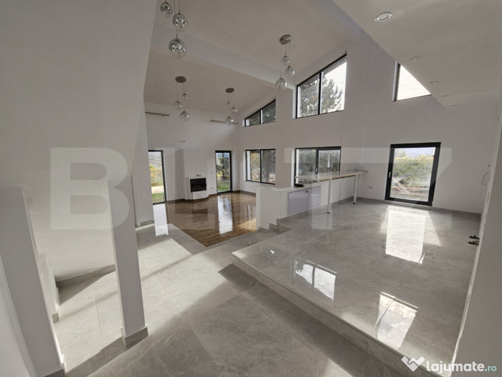 Parter: living cu bucatarie open space, dormitor matrimonial cu dressing si baie proprie, 2 dormitoare, baie de serviciu, hol si scara.