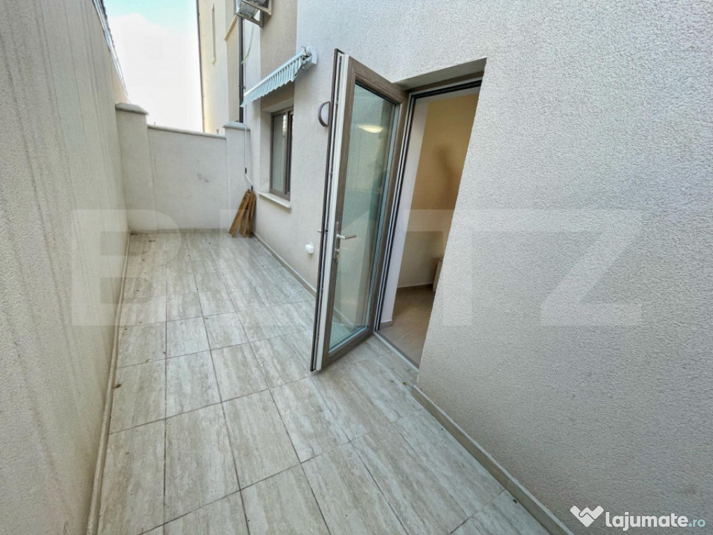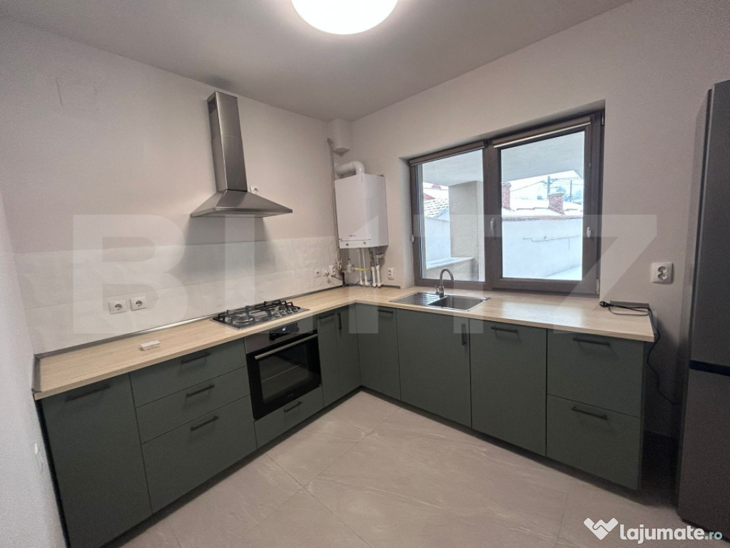 Dispune de finisaje de calitate, dar si de alte facilitati precum: terasa privata cu copertina, loc de parcare privat, centrala termica, aer conditionat, masina de spalat vase, frigider, cuptor, plita pe gaz, hota, masina de spalat si aspirator.