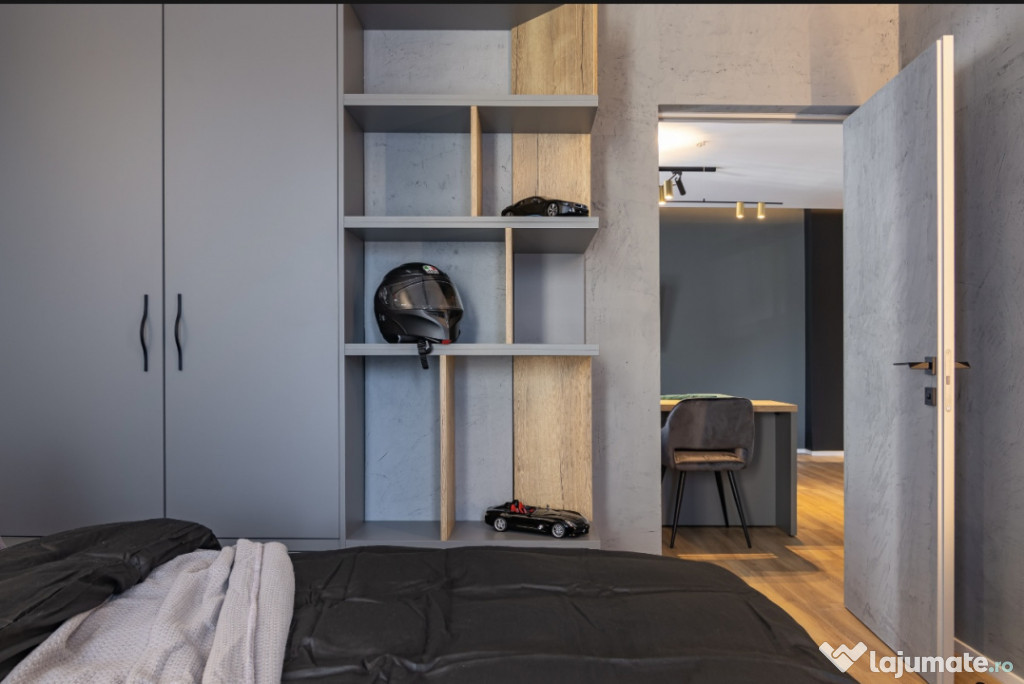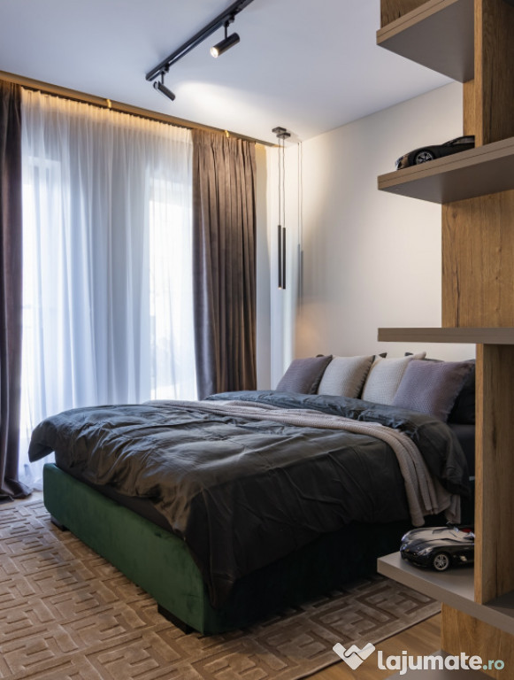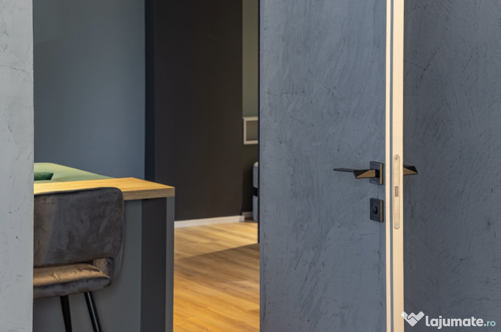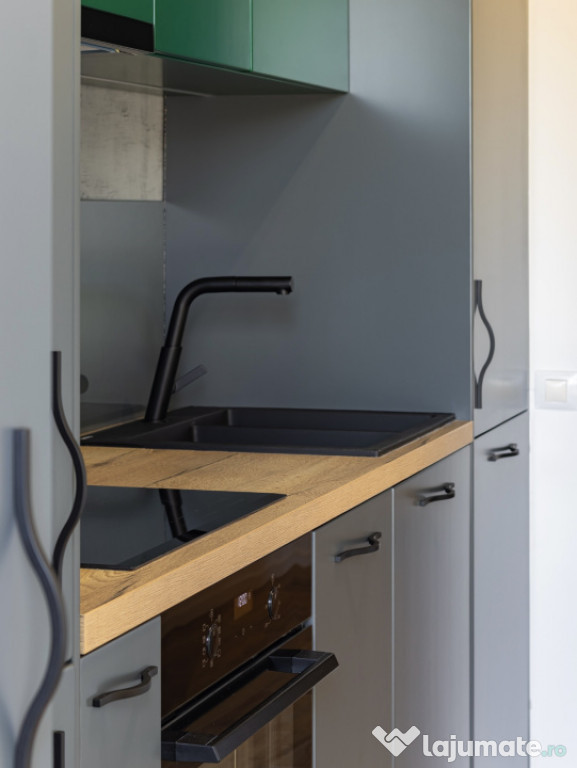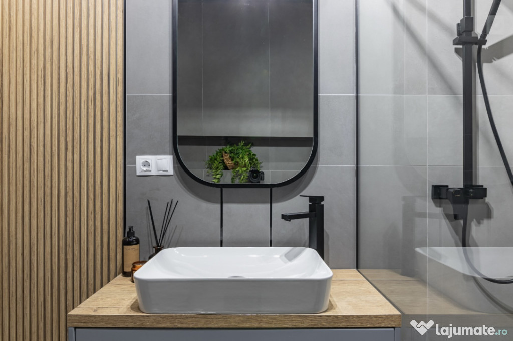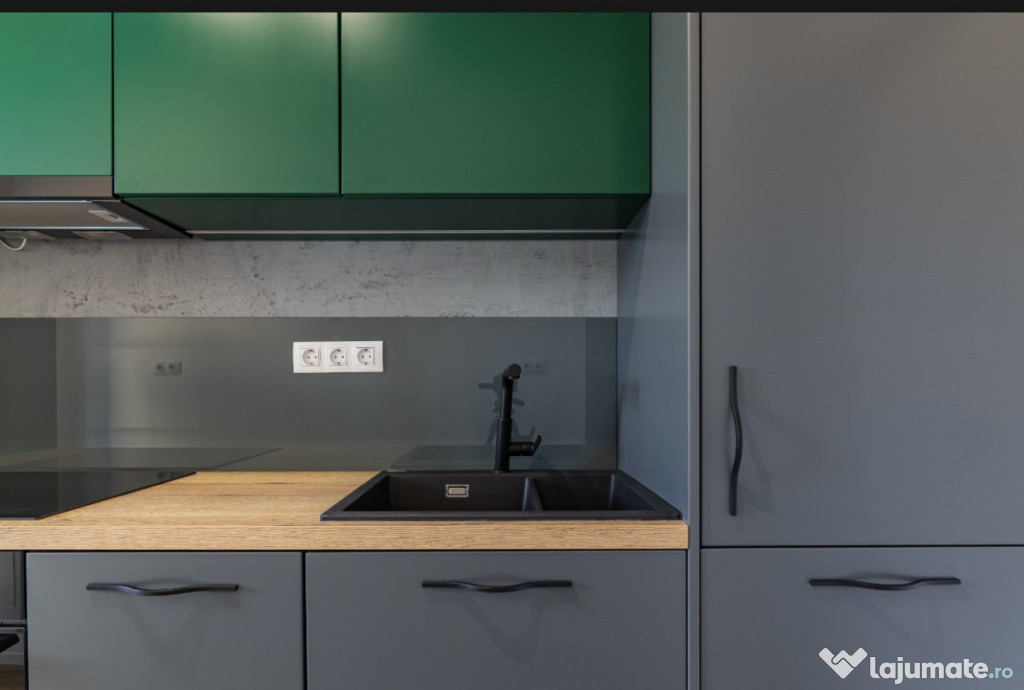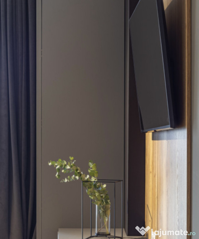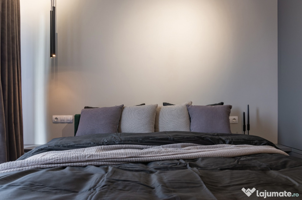 Locuința este închiriată full mobilată și utilată la standarde premium: două televizoare 4K, cuptor electric, plită, cuptor cu microunde, frigider, mașină de spălat și uscat rufe, mașină de spălat vase, hotă, set complet de veselă și tacâmuri, lenjerii, prosoape, perne și plapumă. Toate utilitățile sunt active: gaz, curent, internet și TV Digi, apă Vital.