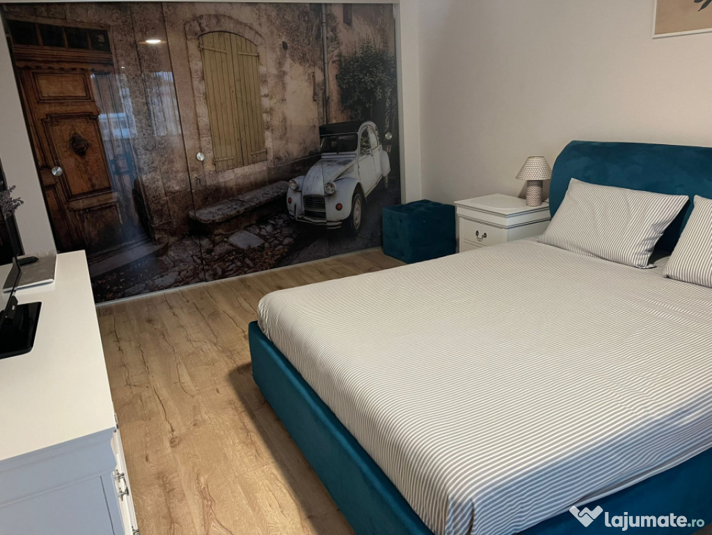 Livingul este generos, cu un design aerisit, canapea confortabila, TV SMART si o zona de dining. Bucataria este dotata cu electrocasnice moderne si mobilier cu finisaje moderne, oferind un ambient cald si elegant. Dormitorul continua aceeasi linie estetica, cu un pat matrimonial generos, spatii inteligente de depozitare incorporate si un design coerent. Baia este amenajata cu finisaje premium, dus cu sticla transparenta, obiecte sanitare moderne.