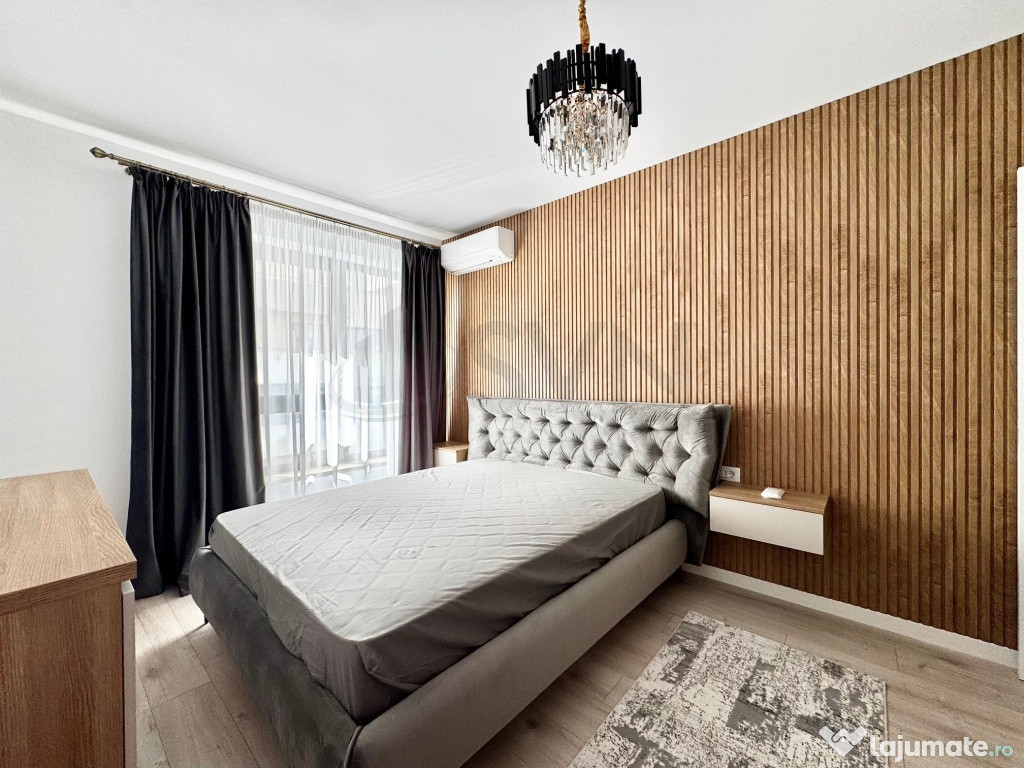 Dormitorul este un sanctuar de odihna, cu un design sofisticat si o atmosfera relaxanta.