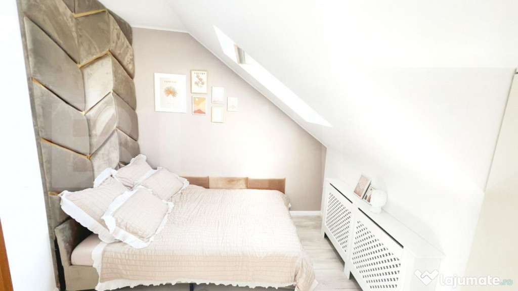 • Dormitor spațios, cu pat matrimonial și multiple spații de depozitare;