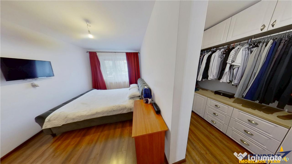 Dormitorul matrimonial ofera un plus de intimitate si confort, fiind prevazut cu baie proprie si dressing generos, perfect integrat in spatiu. Acest colt privat al locuintei devine un adevarat refugiu personal, ideal pentru relaxare dupa o zi activa.