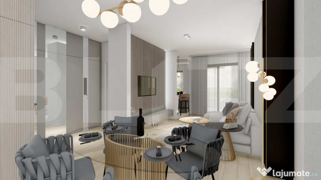 Spațiul este generos și decomandat – un living luminos cu bucătărie deschisă, dormitor separat și baie complet echipată, totul într-un ambient primitor și modern.