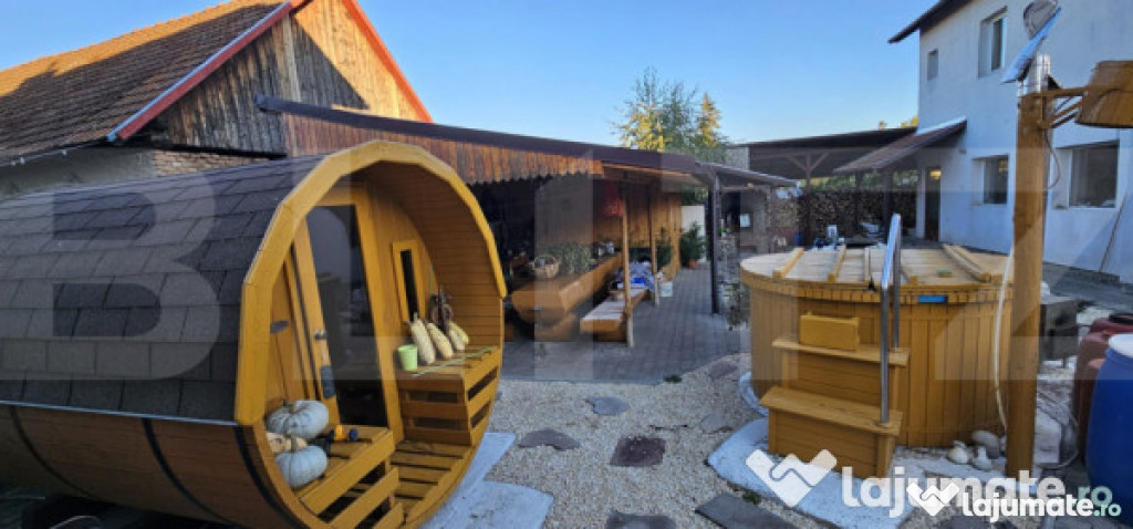 Casa oferă numeroase facilități care asigură confort și relaxare: saună, ciubăr, foișor, iaz cu pești, grădină amenajată în față și o a doua grădină în spate cu pomi fructiferi și spațiu pentru grădinărit.