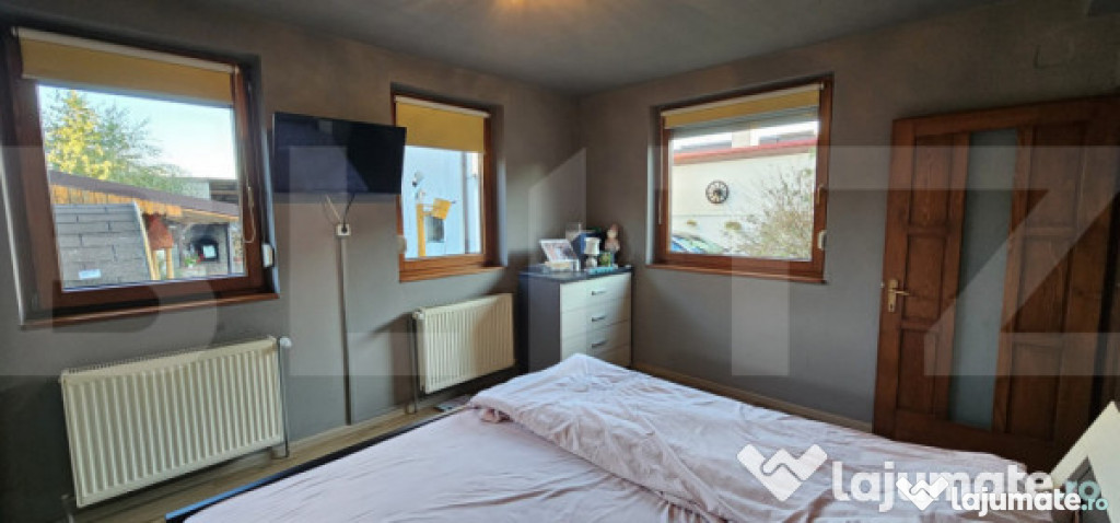În spatele proprietății, deasupra garajului, se află o locuință suplimentară construită tot din cărămidă, cu o suprafață de 40,5 mp, compusă din dormitor și baie, având sistem de încălzire propriu, prin calorifere alimentate de o sobă pe lemne.