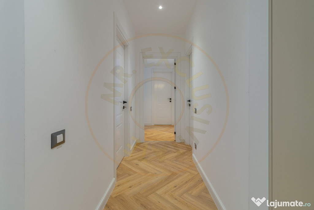 Finisajele se vad din prima. Parchet montat in model herringbone, usi si detalii premium, linii simple si culori calde.