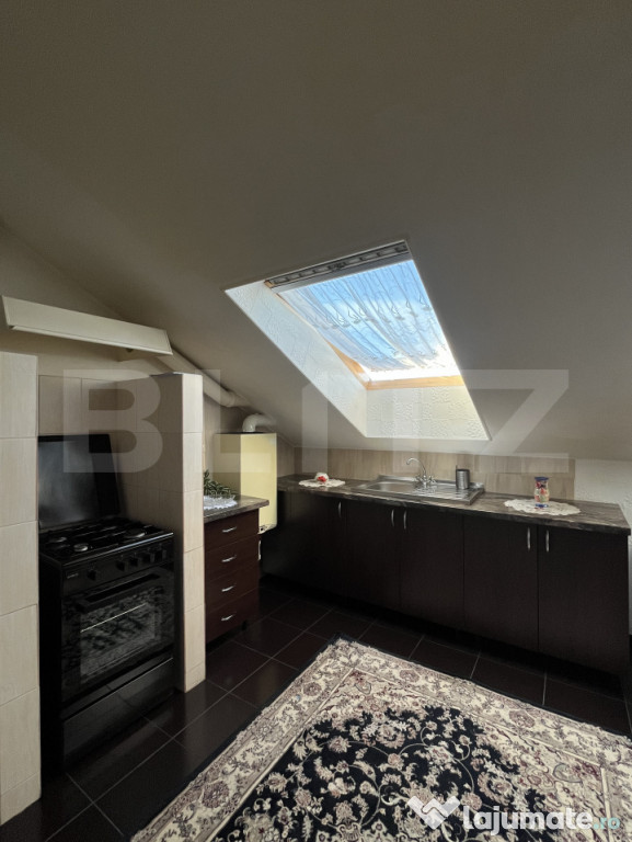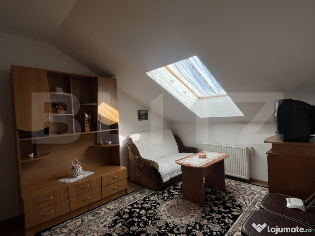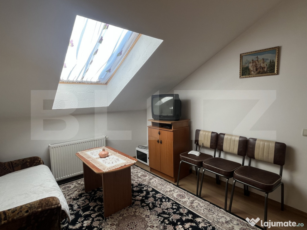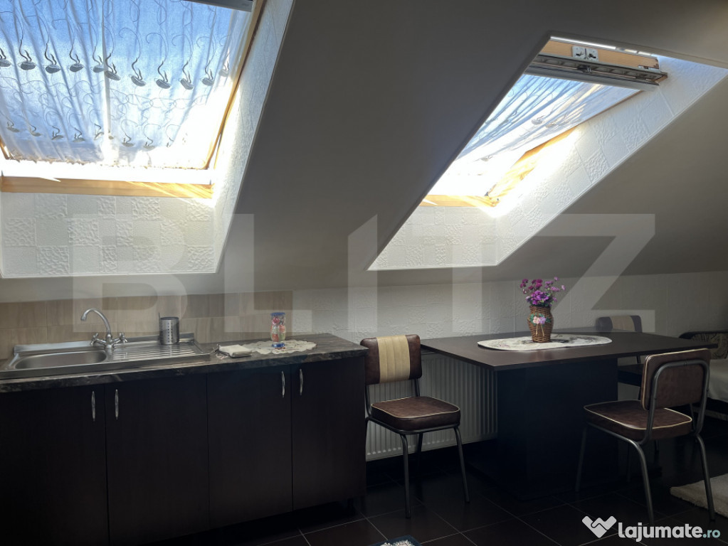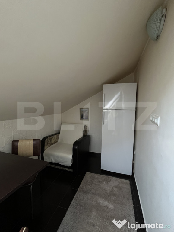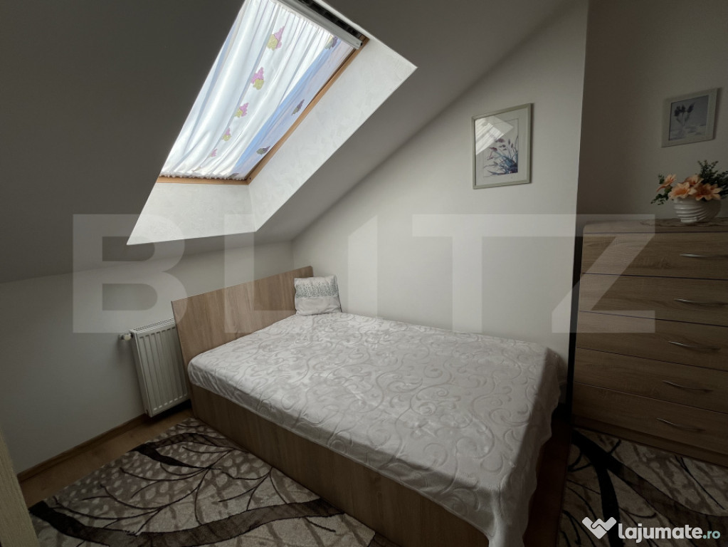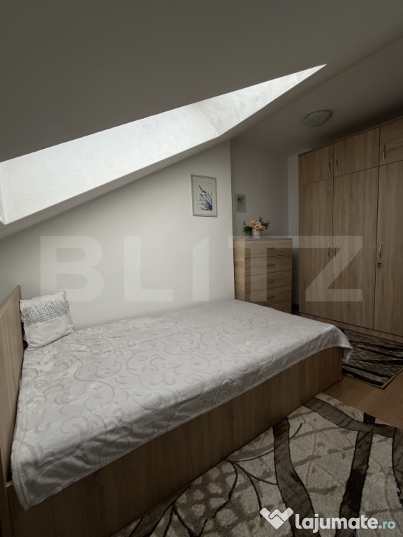 Blitz oferă spre închiriere un apartament cu 2 camere, situat în Florești, zona Florilor. Acesta se află la mansardă și reprezintă o alegere ideală pentru un cuplu.Apartamentul are o suprafață utilă de 47 mp, este complet mobilat și gata de utilizare. Compartimentarea este eficientă, fiind alcătuit dintr-un dormitor, un living separat, o bucătărie și o baie.