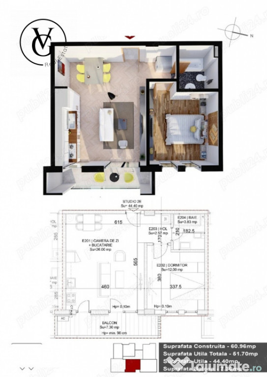 Apartamentul dispune de o suprafață utilă de 44,40 mp, la care se adaugă un balcon spațios de 7,30 mp, însumând astfel o suprafață totală de 51,70 mp.