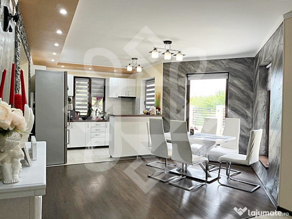 Parterul este compus din living elegant, open space cu bucatarie si locul de luat masa, un birou, care la nevoie poate fi amenajat ca si dormitor. Tot aici este amenajata o baie spatioasa cu dus. La exterior, in continuarea casei se afla un garaj cu poarta automatizata.