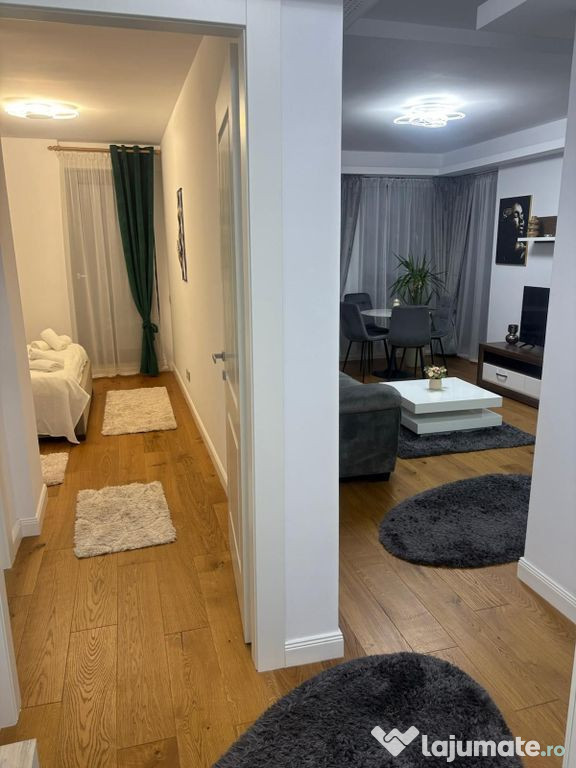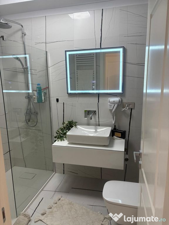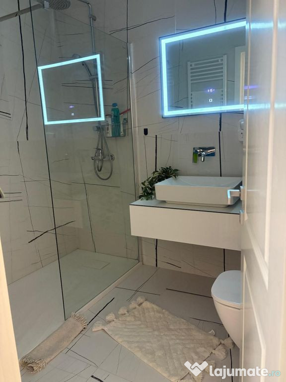 Apartamentul beneficiaza de 2 bai, terasa de 6 mp, incalzire in pardoseala, bucatarie dotata cu plita gaz, cuptor electric, cuptor microunde, combina frigorifica, masina spalat cu uscator.