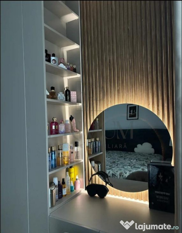 Apartamentul este modern amenajat cu finisaje de inalta calitate, tot mobilierul este realizat pe comanda cu multe spatii de depozitare ( inclusiv patul din dormitor este realizat pe comanda ).