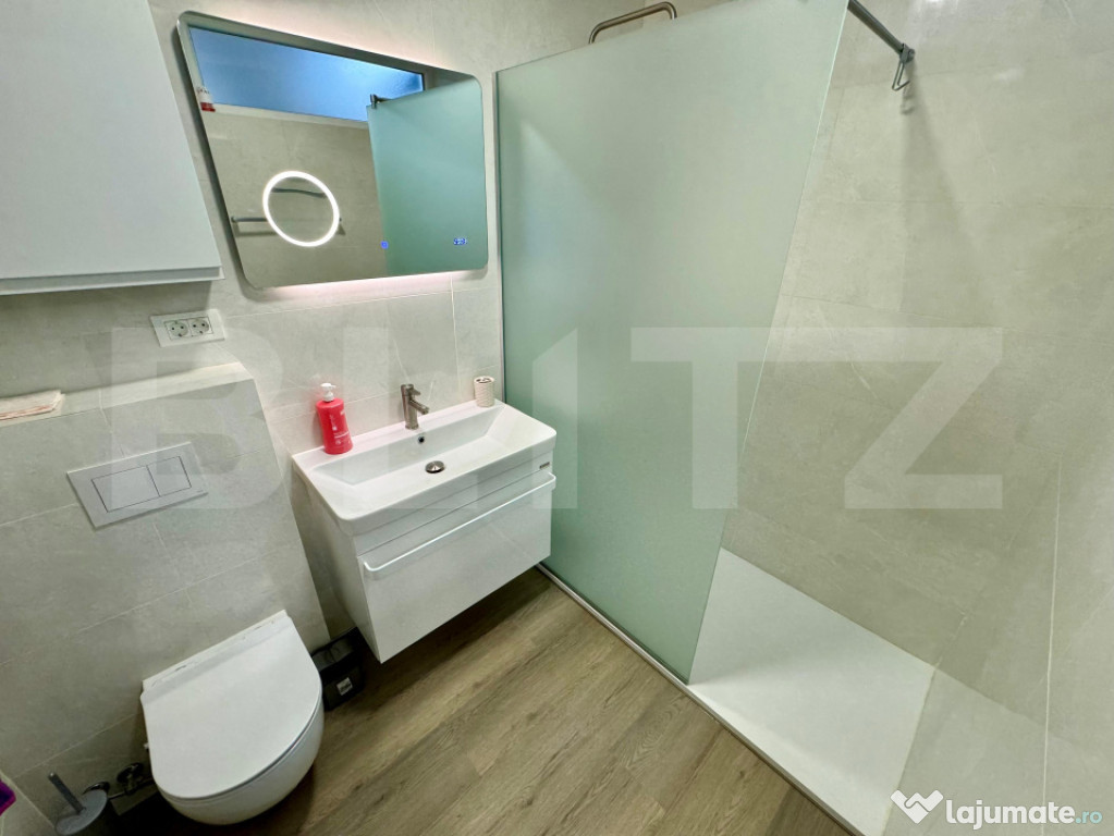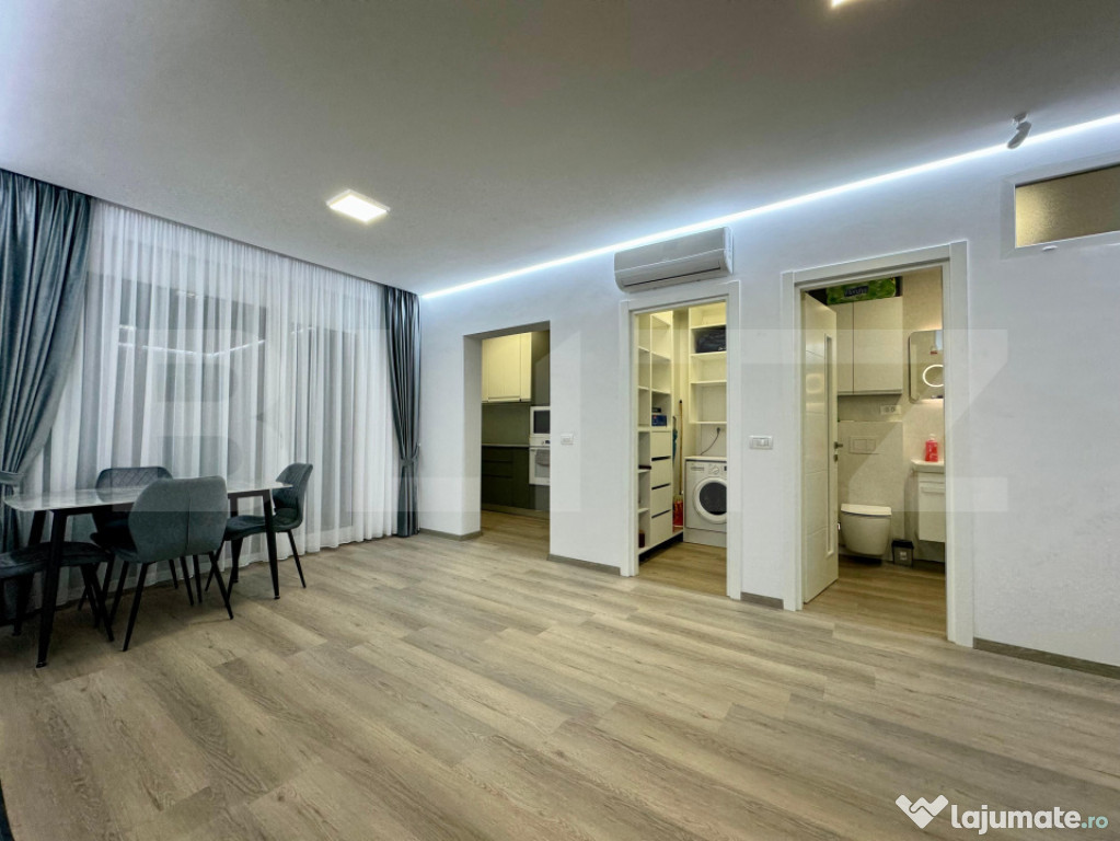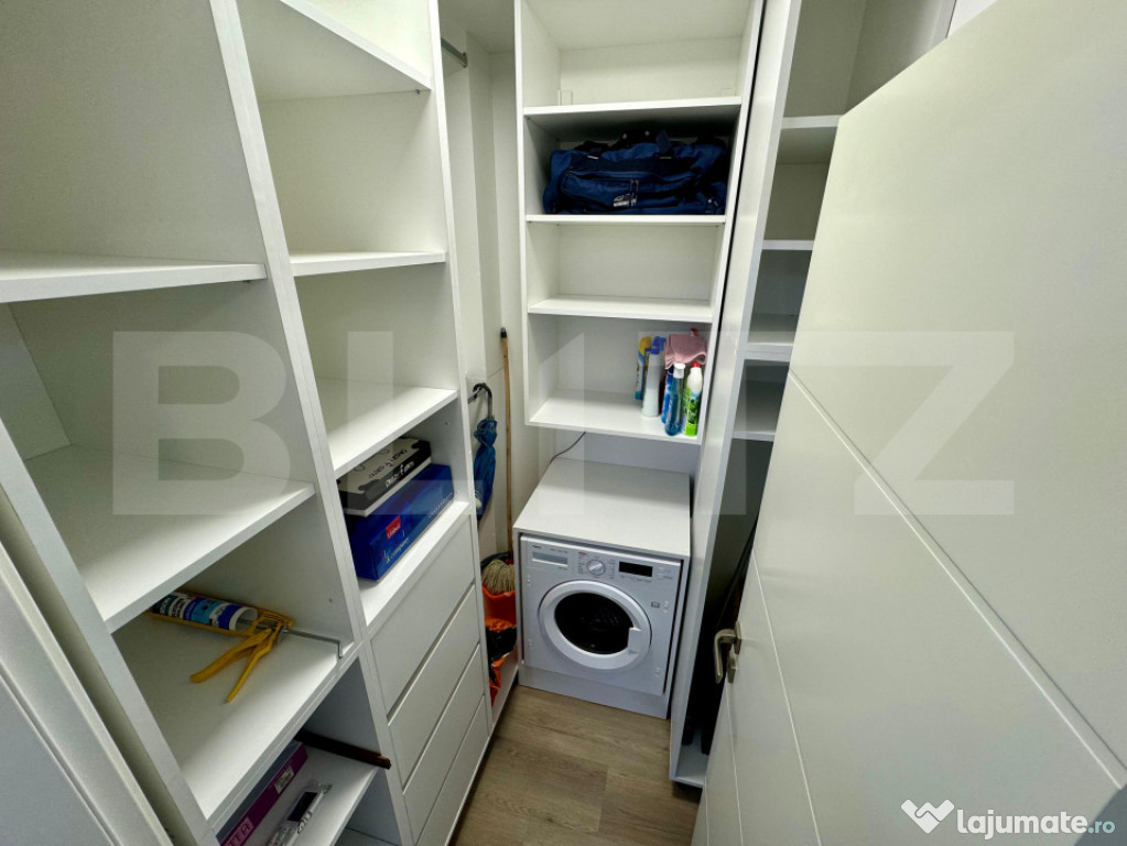 Holul de 2.62 mp oferă acces direct în livingul spațios de 30.23 mp, un spațiu luminos și primitor. Bucătăria este separată, având 5.90 mp, complet mobilată și utilată. Dormitorul măsoară 12 mp, este bine delimitat de zona de zi și oferă suficient spațiu pentru confortul personal. Baia are 4.44 mp, iar imediat după aceasta se află spațiul tip logie de 3.64 mp, amenajat inteligent cu mașină de spălat–uscat (2 în 1) și rafturi pentru depozitare, devenind o zonă tehnică extrem de utilă în locuință.