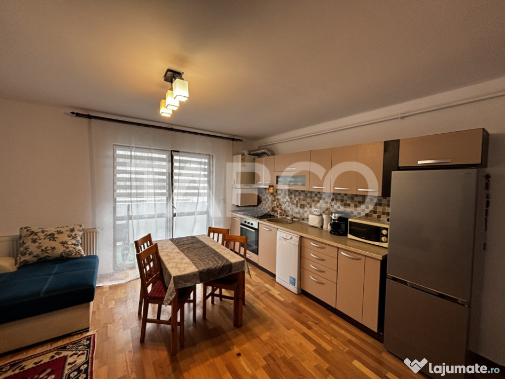 Apartamentul se inchiriaza mobilat si utilat cu: plita pe gaz, cuptor, hota, masina de spalat rufe, masina de spalat vase, frigider cu congelator, cuptor cu microunde, espressor de cafea.