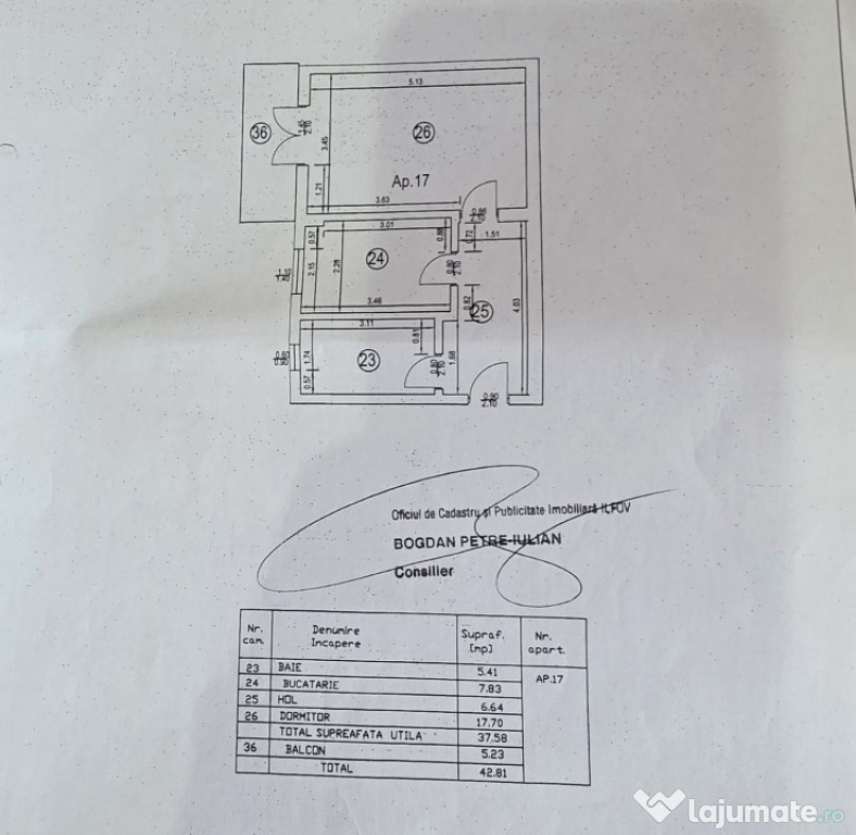 Garsoniera este situata la etajul 1 din 4, este decomandata, are o suprafata utila de 37,58 mp + balcon 5,23 mp, rezultand o suprafata totala de 42,81 mp.