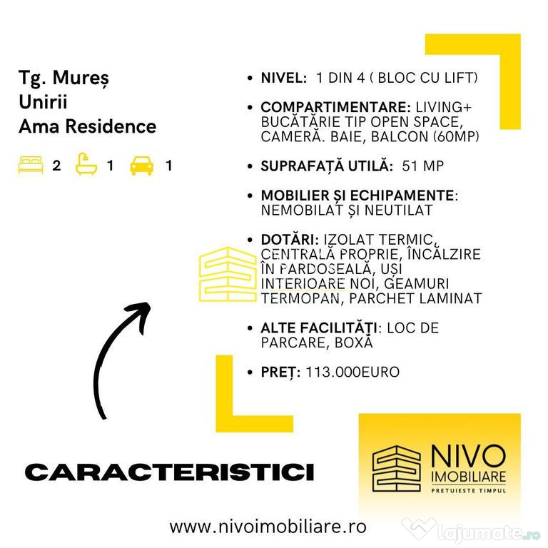 BV/338 Nivo Imobiliare vă propune spre vânzare acest apartament situat în Tg. Mureș, cartierul Unirii, Ama Residence.Apartamentul se află la etajul 1 din 4 într-un bloc nou cu lift şi este compus din living + bucătărie tip open space, cămară, baie şi balcon ( 60mp ) având suprafața totală de 51 mp.