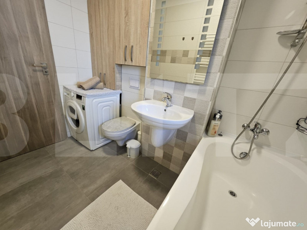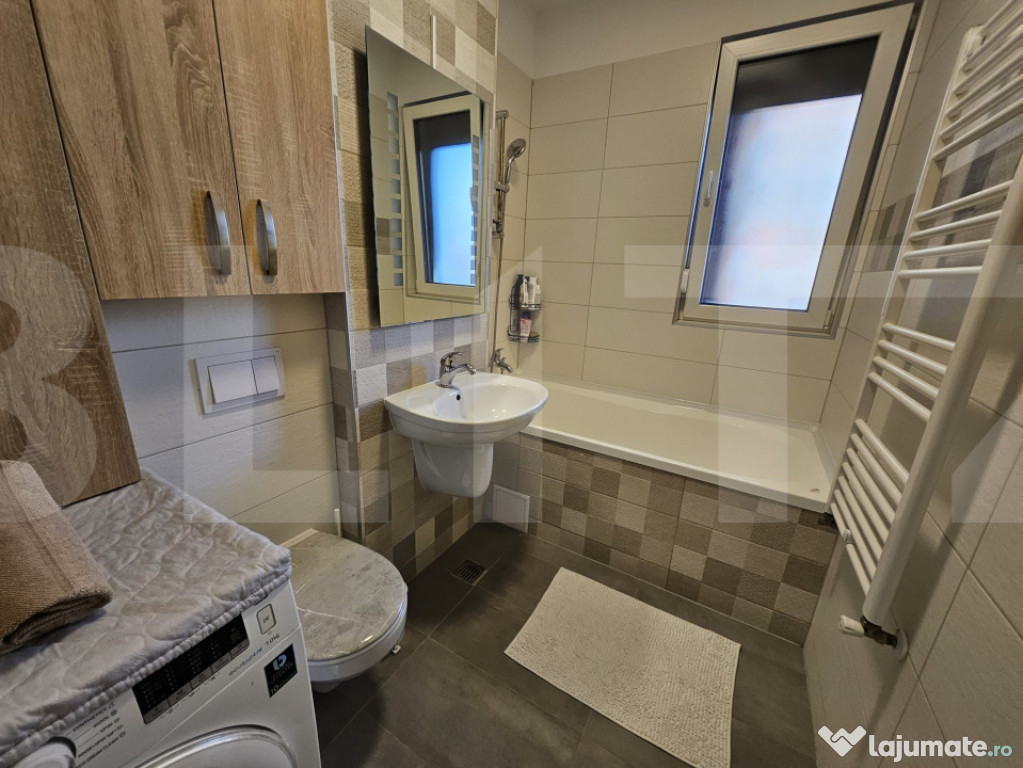 • Baie luminoasă, prevăzută cu geam și complet utilată cu obiecte sanitare moderne