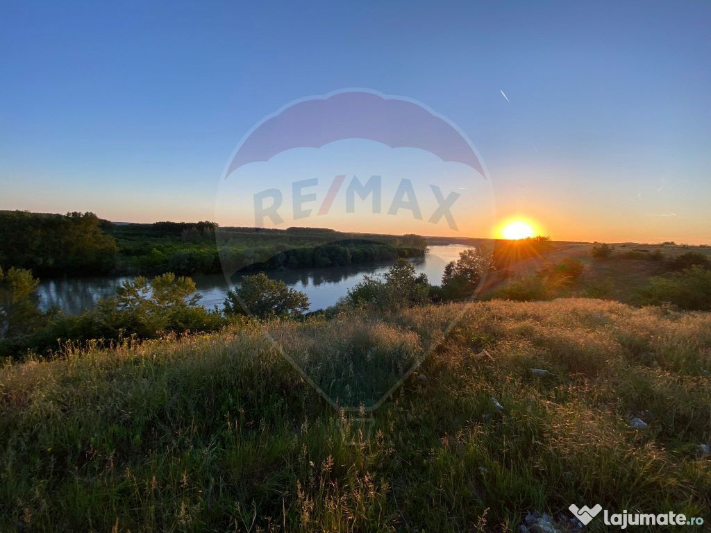 Vedere panoramică către râul Jiu. Terenul se află pe o mică înălțime, oferind o priveliște spectaculoasă asupra împrejurimilor.